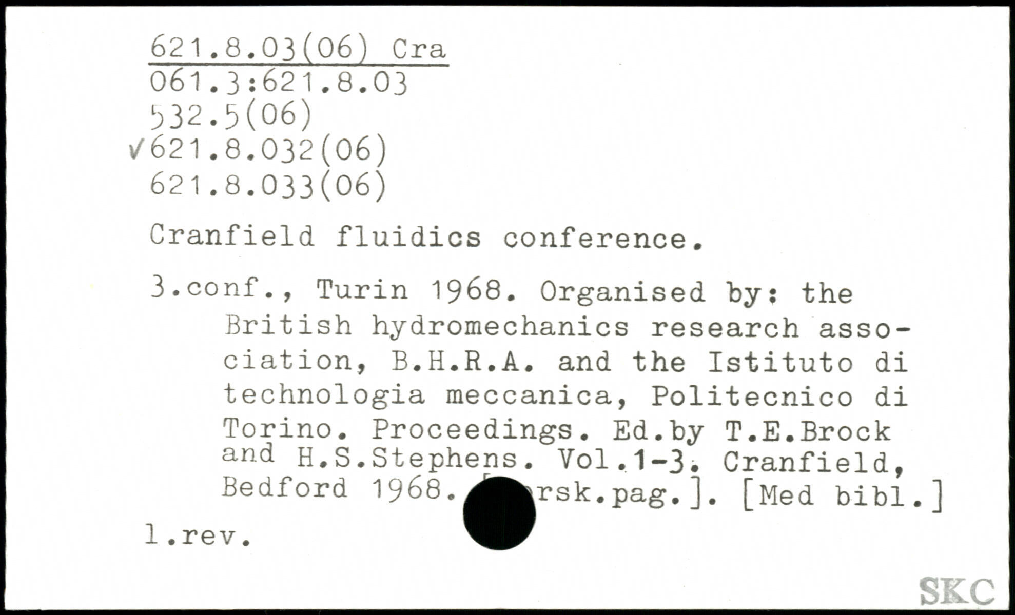 Cranfield fluidics conference. 3.conf., Turin 1968. Organised by: the British hydromechanics research association, B.H.R.A. and the Istituto di technologia raeccanica, Politecnico di Torino. Proceedings. Ed.by T.E.Brock and H.S.Stephens.