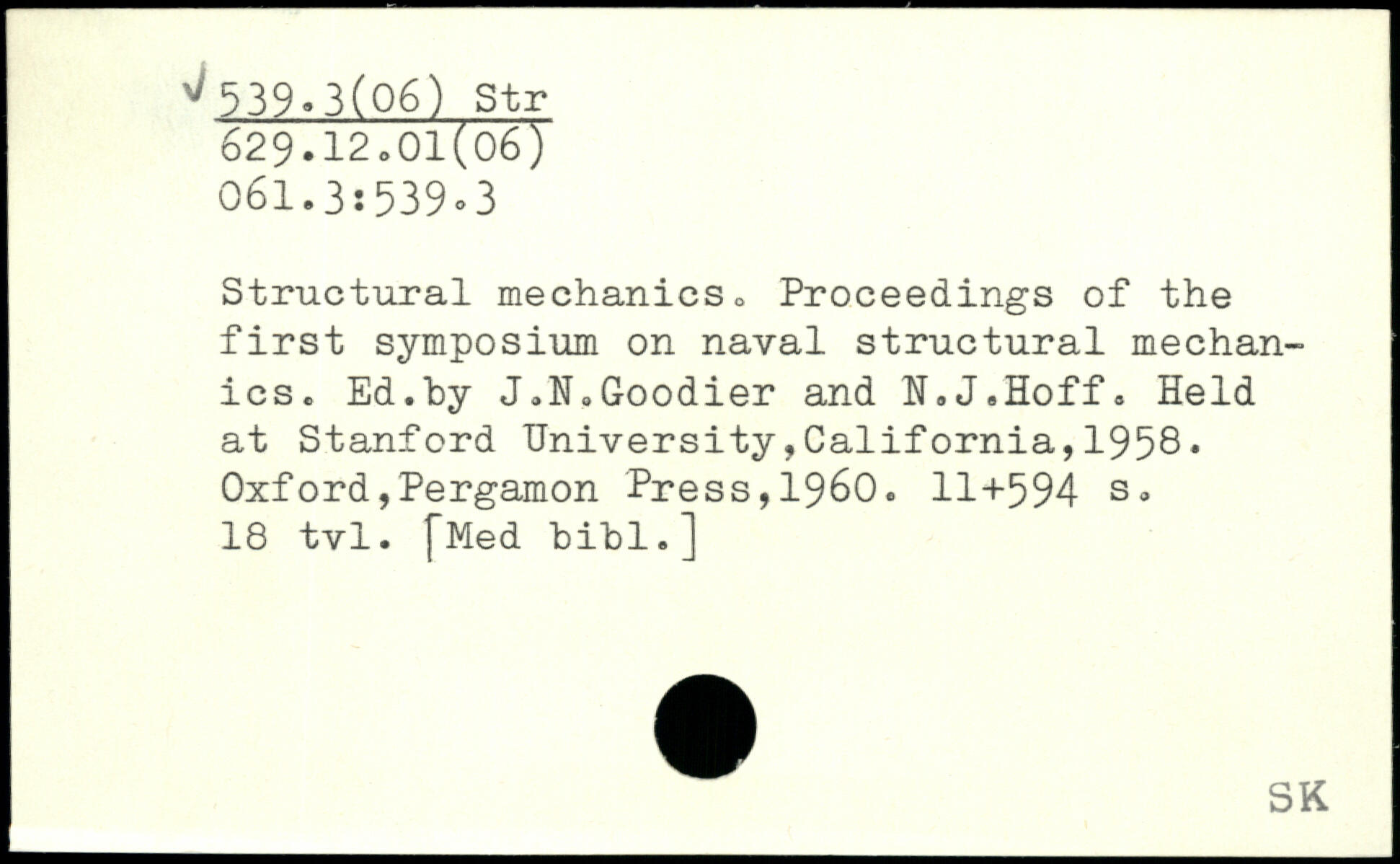 Structural mechanicso Proceedings of the first symposium on naval structural mechanics. Ed.by J.N.Goodier and U.J.Hoff.