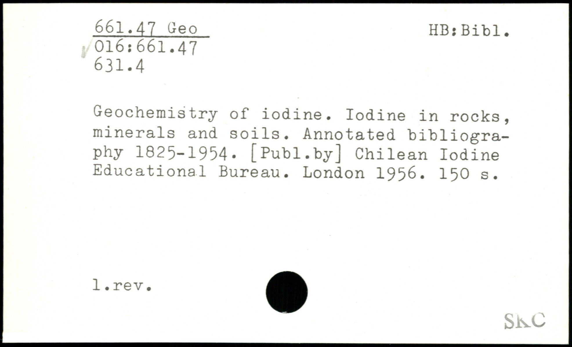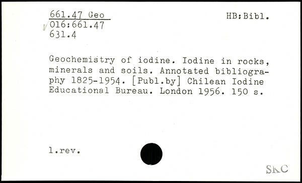 Geochemistry of iodine. Iodine in rocks, minerals and soils. Annotated bibliography 1825-1954.