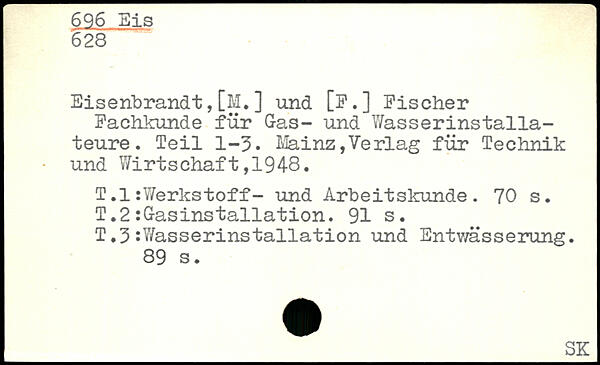 Eisenbrandt,[M.] und [F. ] Fischer Fachkunde für Gas- und Wasserinstallateure. Teil 1-3. Mainz,Verlag für Technik. und Wirtschaft,1948. T .1 :Y/erkstoff- und Arbeitskunde.