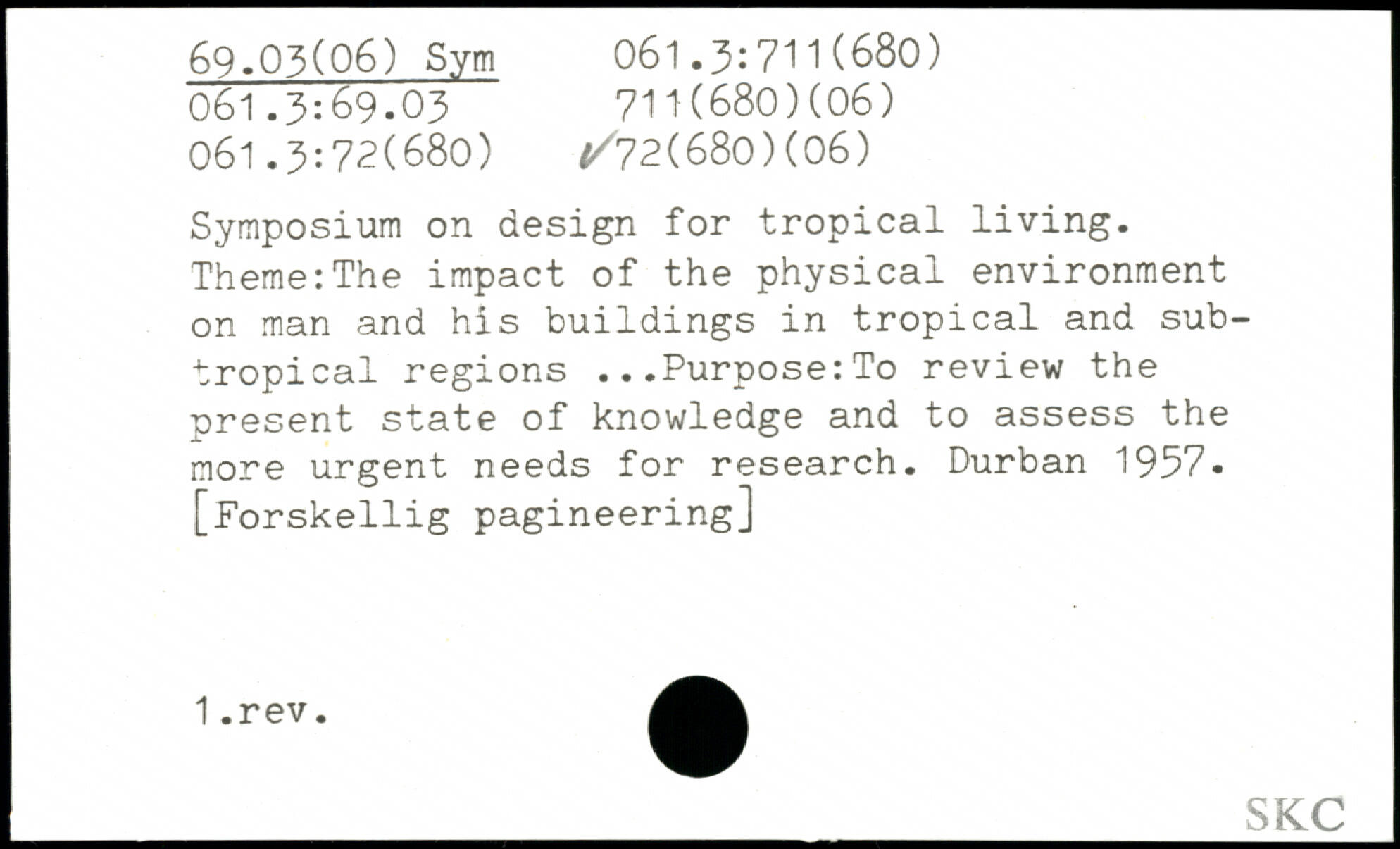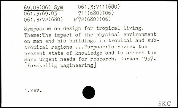 Symposium on design for tropical living. Theme:The impact of the physical environment on man and his buildings in tropical and subtropical regions ...Purpose:To review the present state of knowledge and to assess the more urgent needs for research. Durban 1957. [Forskellig pagineering]