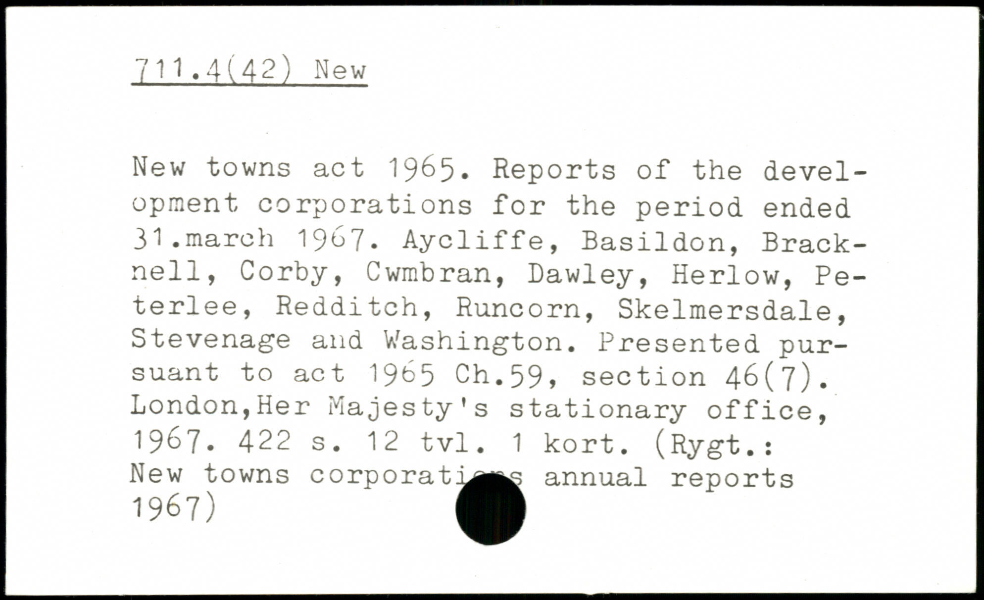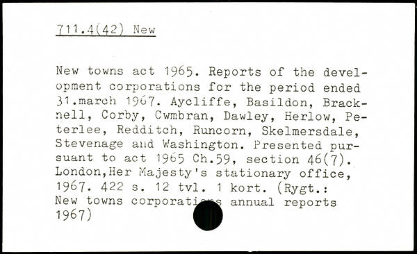 New towns act 1965. Reports of the development corporations for the period ended 31.march 1967. Aycliffe, Basildon, Bracknell, Corby, Cwmbran, Dawley, Herlow, Pe-terlee, Redditch, Runcorn, Skelmersdale, Stevenage and Washington. Presented pursuant to act 1965 Ch.59, section 46(7). London,Her Majesty's stationary office, 1967.