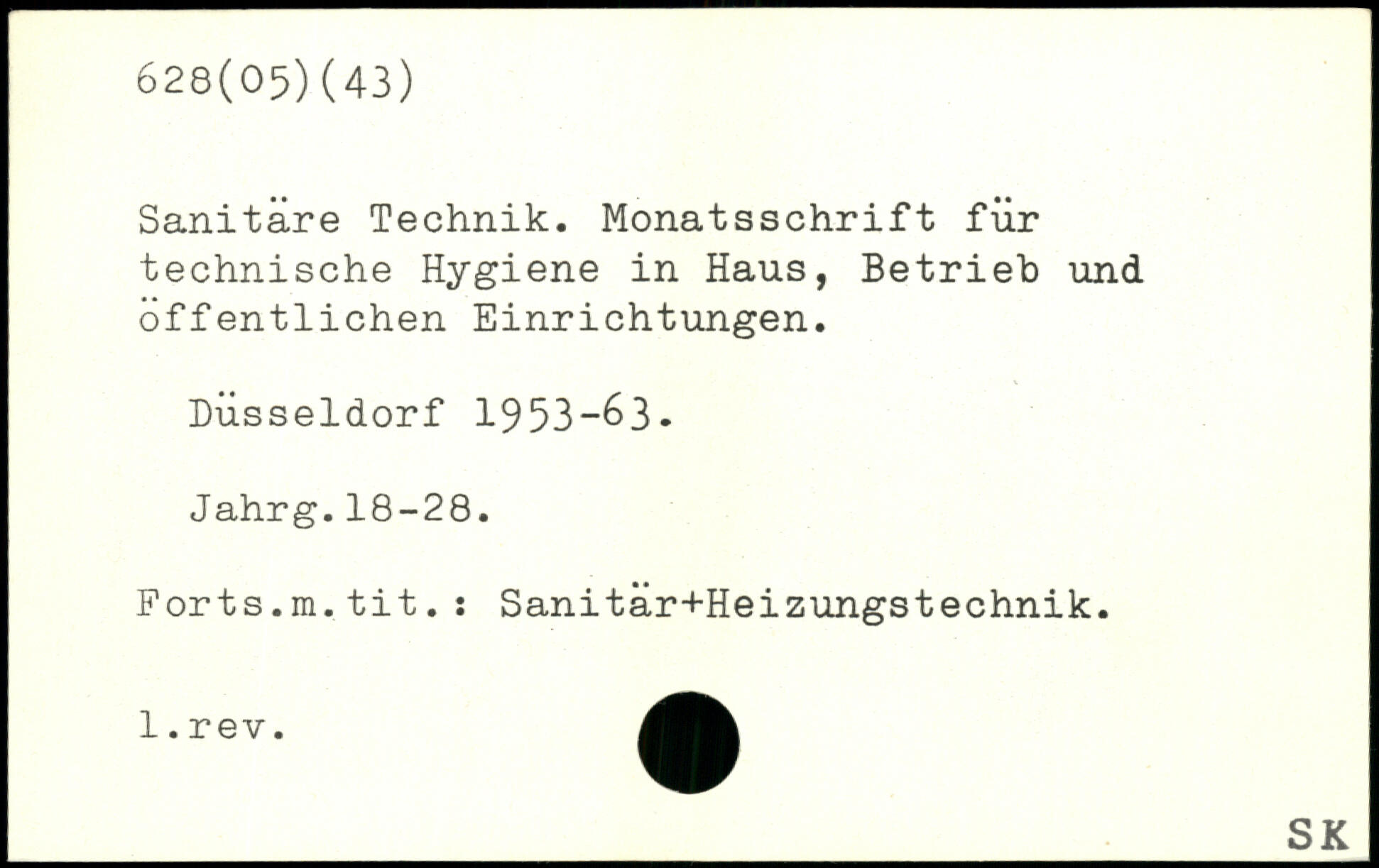 Sanitäre Technik. Monatsschrift für technische Hygiene in Haus, Betrieb und öffentlichen Einrichtungen. Düsseldorf 1953-63. Jahrg.18-28. Forts.m.tit.: Sanitär+Heizungstechnik. _SK