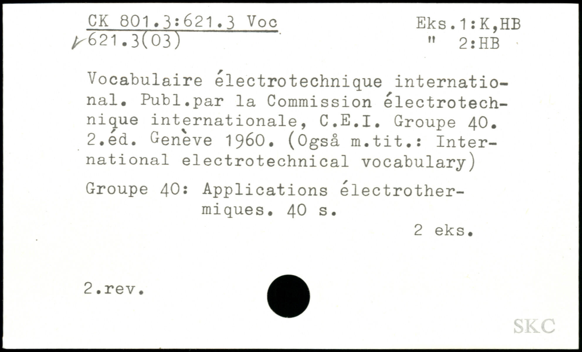 Vocabulaire electrotechnique international. Publ.par la Commission électrotechnique internationale, C.E.I. Groupe 40. 2.éd. Geneve 1960. (Også m.tit.: International electrotechnical vocabulary) Groupe 40: Applications électrothermiques.
