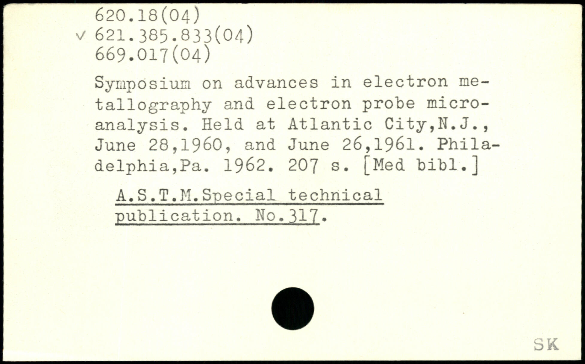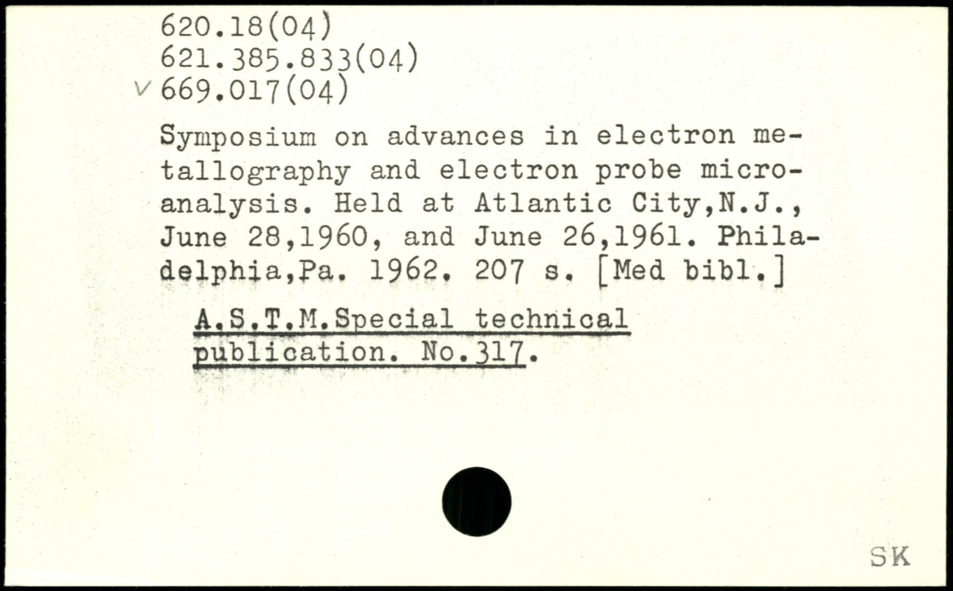 Symposium on advances in electron metallography and electron probe microanalysis. Held at Atlantic City,N.J., June 28,1960, and June 26,1961. Philadelphia,Pa. 1962.