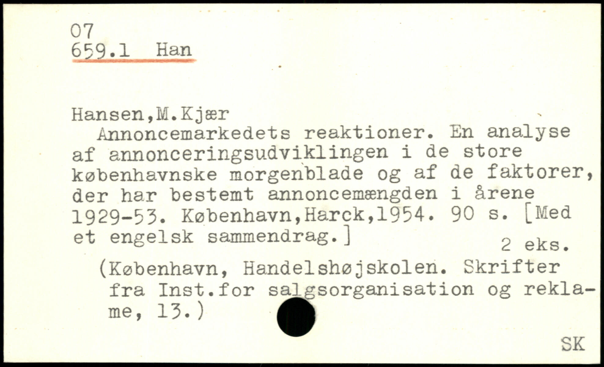 659.1 Han Hansen,!.Kjær Annoncemarkedets reaktioner. En analyse af annonceringsudviklingen i de store københavnske morgenblade og af de faktorer, der har bestemt annoncemængden i årene 1929-93.