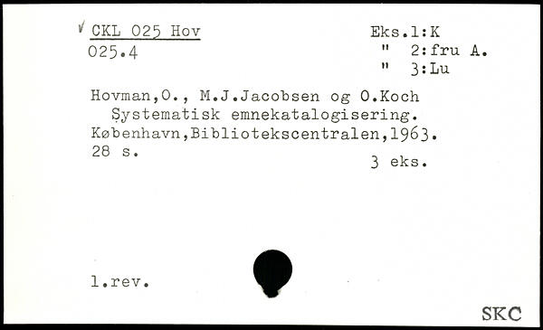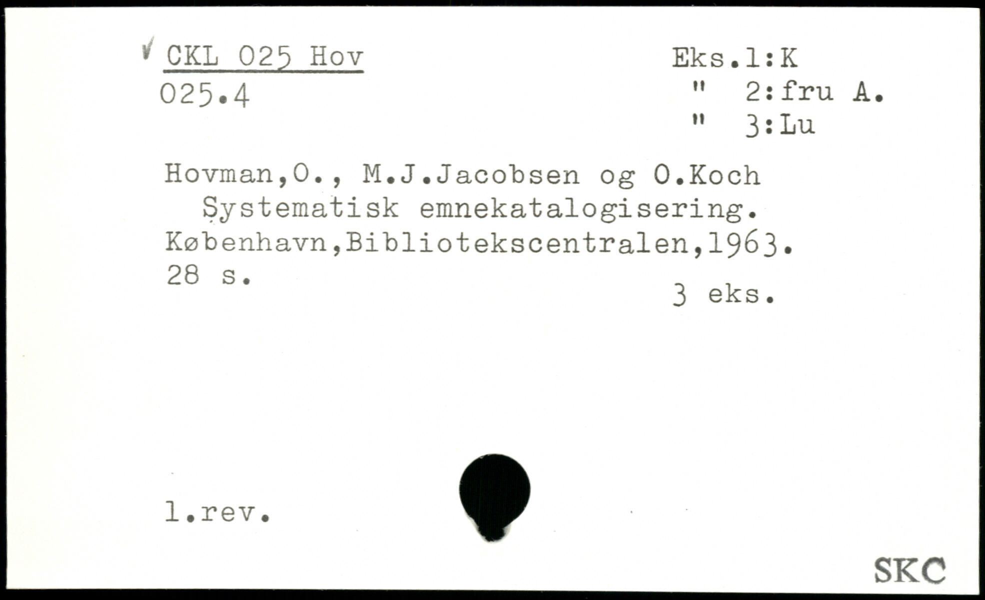 Hovman,0., M.J.Jacobsen og O.Koch Systematisk emnekatalogisering.