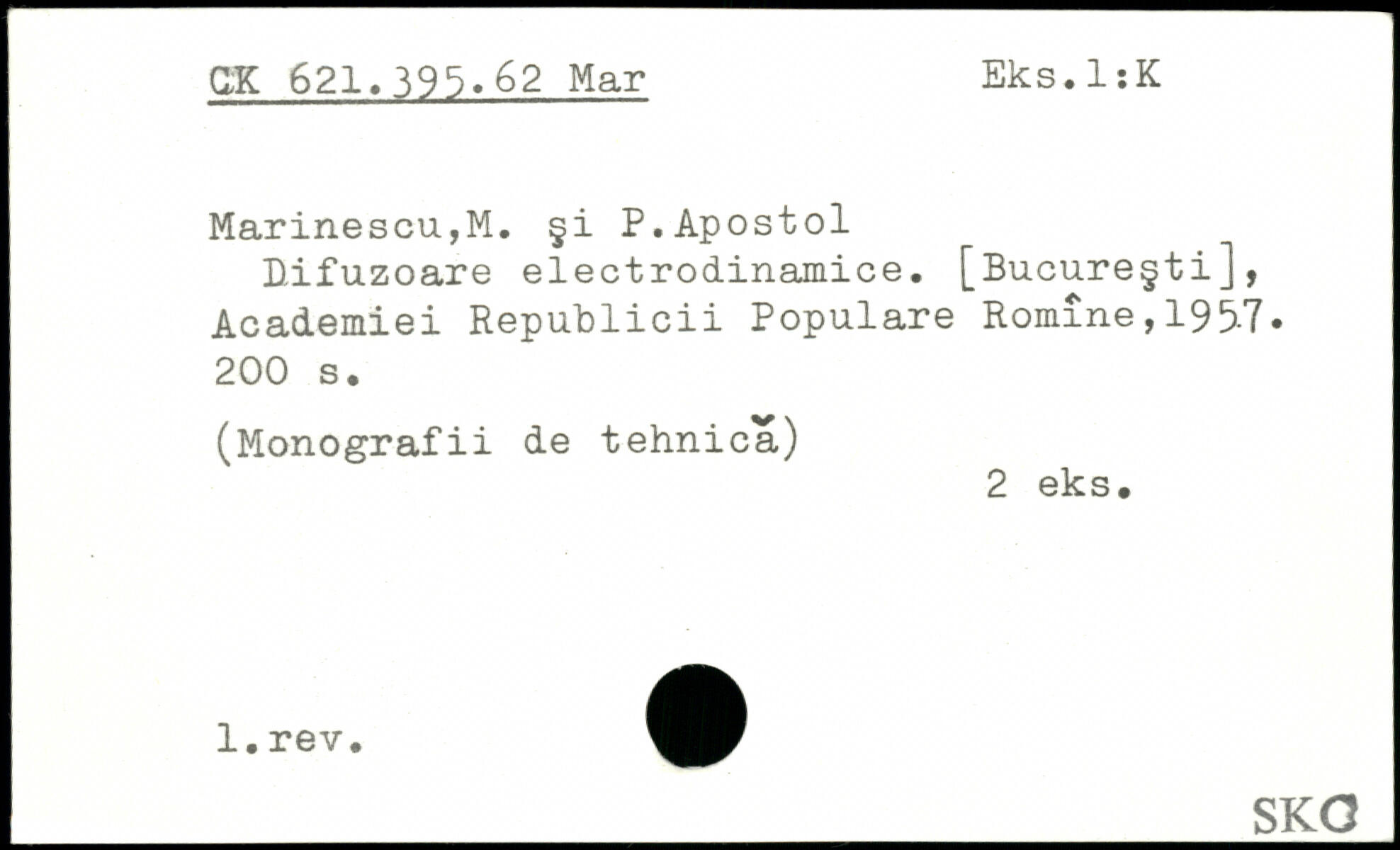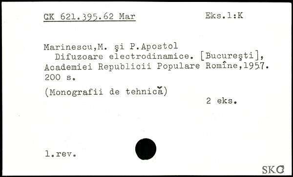 MarinescUjM. §i P.Apostol Difuzoare electrodinamice. [Bucureçti], Academiei Republicii Populäre Romîne, 195-7.