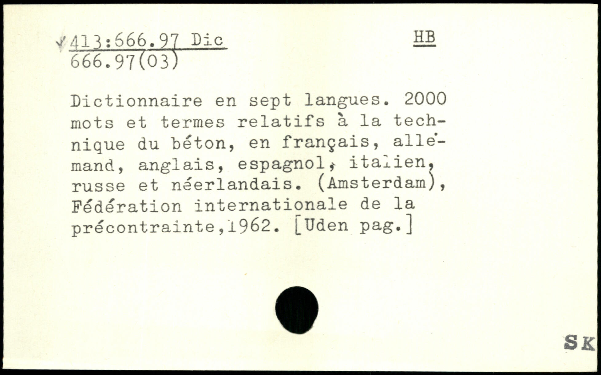 Dictionnaire en sept langues. 2000 mots et termes relatifs à la technique du béton, en français, allemand, anglais, espagnol. itaxien, russe et néerlandais. (Amsterdam), Fédération internationale de la précontrainte,1962. [Uden pag.]