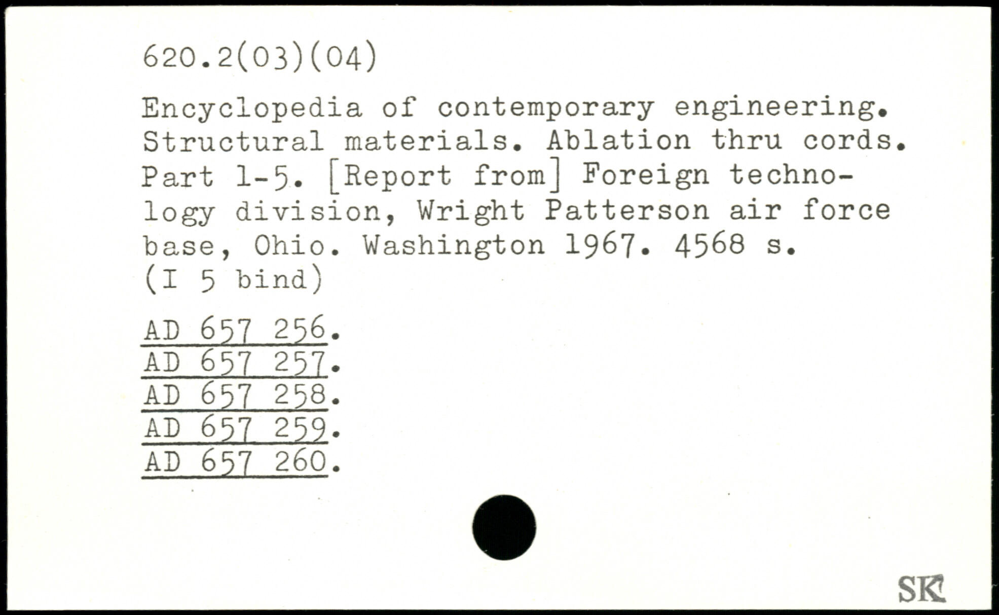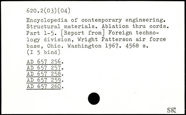 Encyclopedia of contemporary engineering. Structural materials. Ablation thru cords. Part 1-5. [Report from] Foreign technology division, Wright Patterson air force base, Ohio.