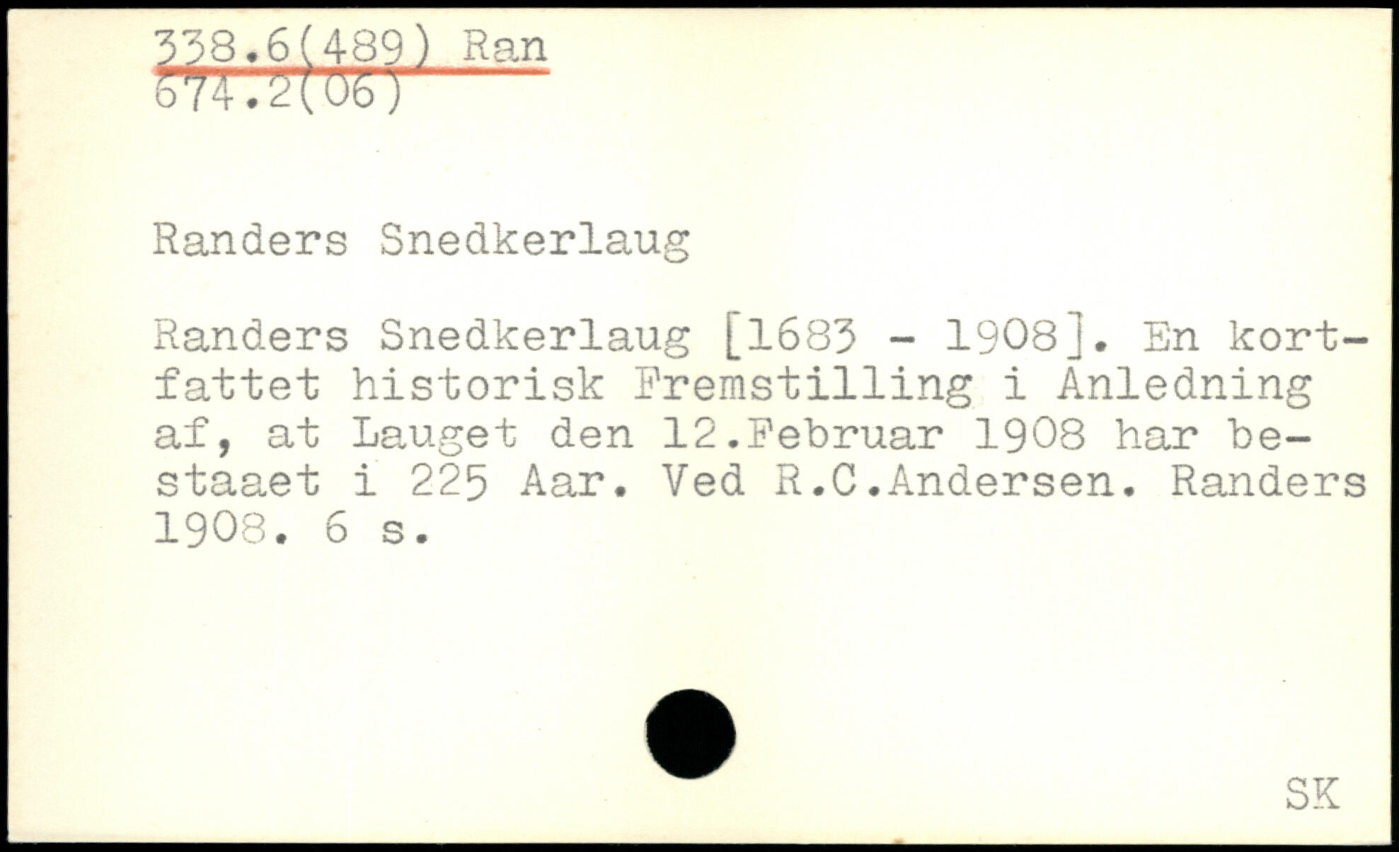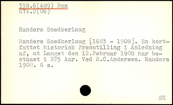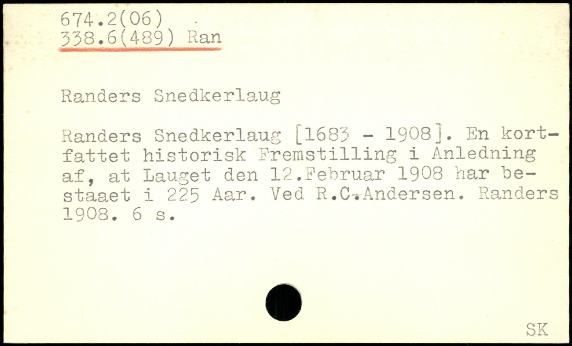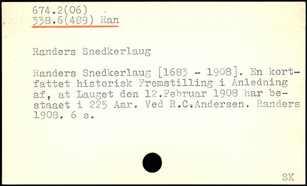 Randers Snedkerlaug Randers Snedkerlaug [1683 - 1908j. En kortfattet historisk Fremst1111ng i Anledning af, at Lauget den 12.Februar 1908 har be-staaet i 225 Aar. Ved R.C.Andersen. Randers 1908.