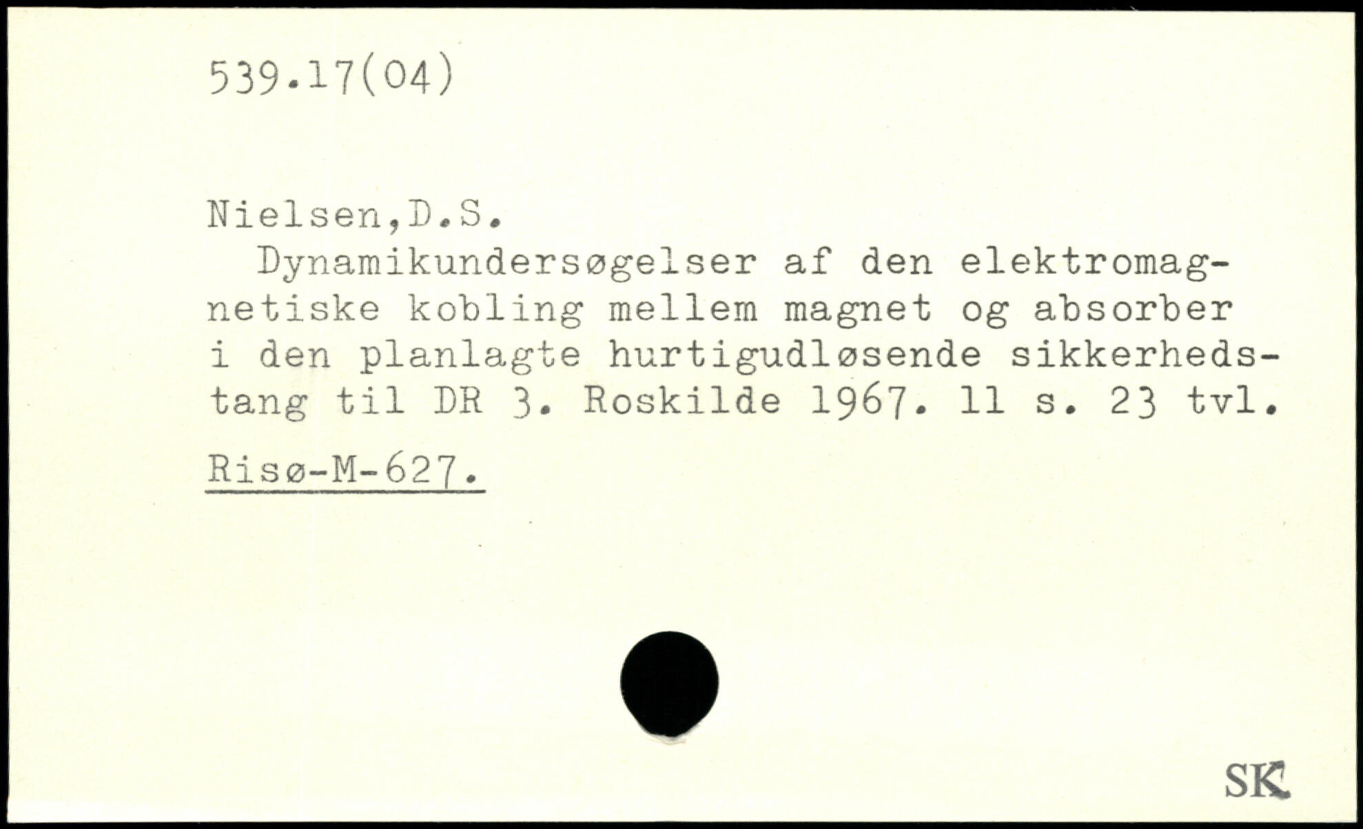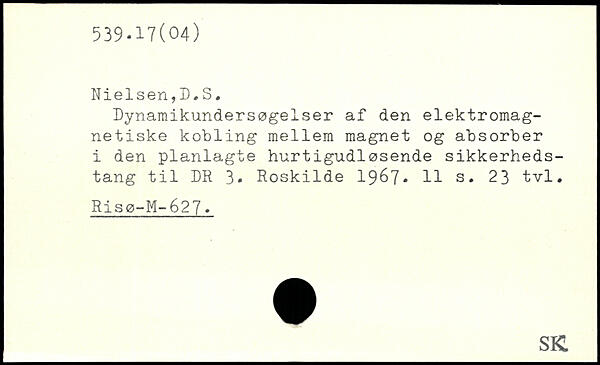 Dynamikundersøgelser af den elektromagnetiske kobling mellem magnet og absorber i den planlagte hurtigudløsende sikkerhedstang til DR 3. Roskilde 1967, H s. 23 tvl. Risø-M-627