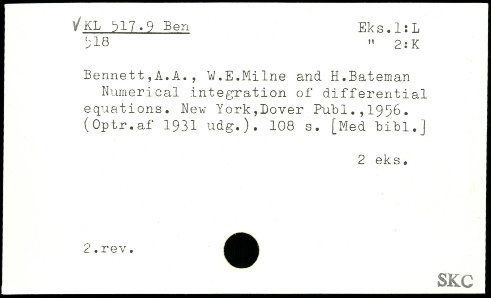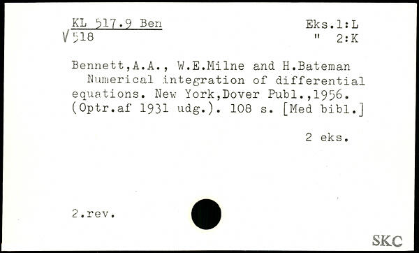 Bennett,A.A., W.E.Milne and H.Bateman Numerical integration of differential equations.
