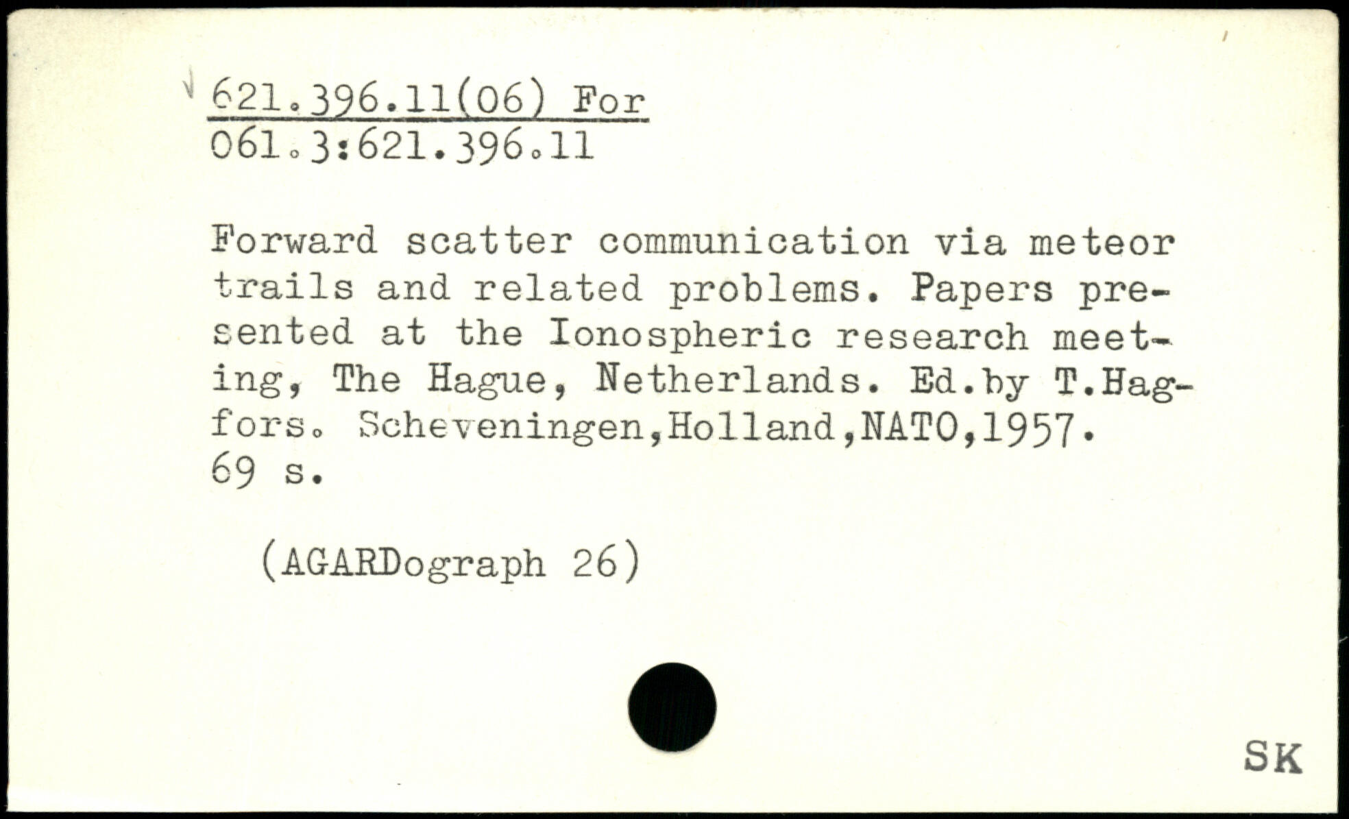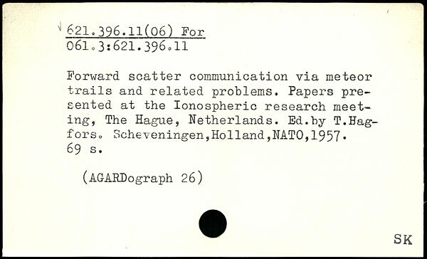 Forward scatter communication via meteor trails and related problems. Papers presented at the Ionospheric research meeting, The Hague, Netherlands. Ed.by T.