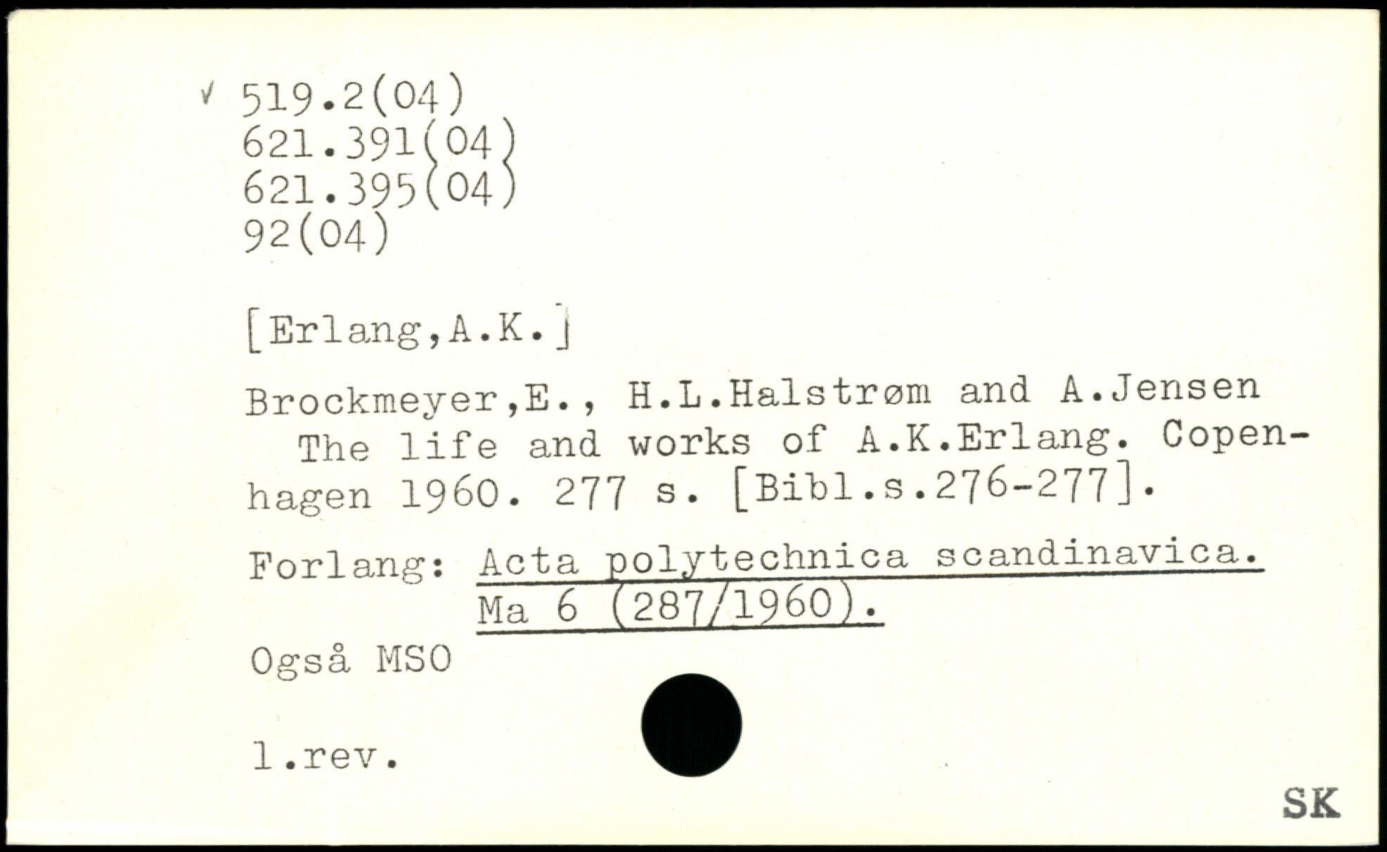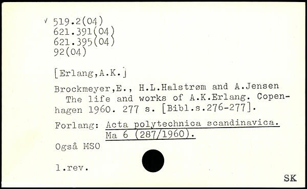[Erlang,A.K.J Brockmeyer ,E. ? H.L.Halstrøni and. A.Jonsen The life and works of A.K.Erlang. Copen-hagen 1960.