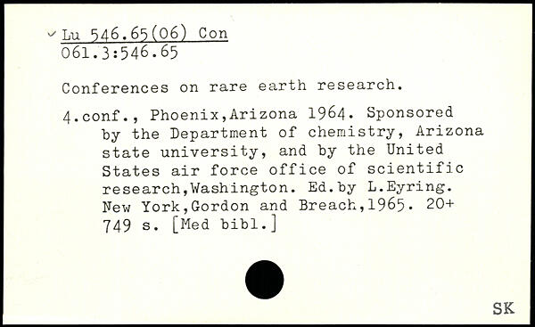 Conferences on rare earth research. 4.conf., Phoenix,Arizona 1964. Sponsored by the Department of chemistry, Arizona state university, and by the United States air force office of scientific research,Washington. Ed.by L.Eyring.