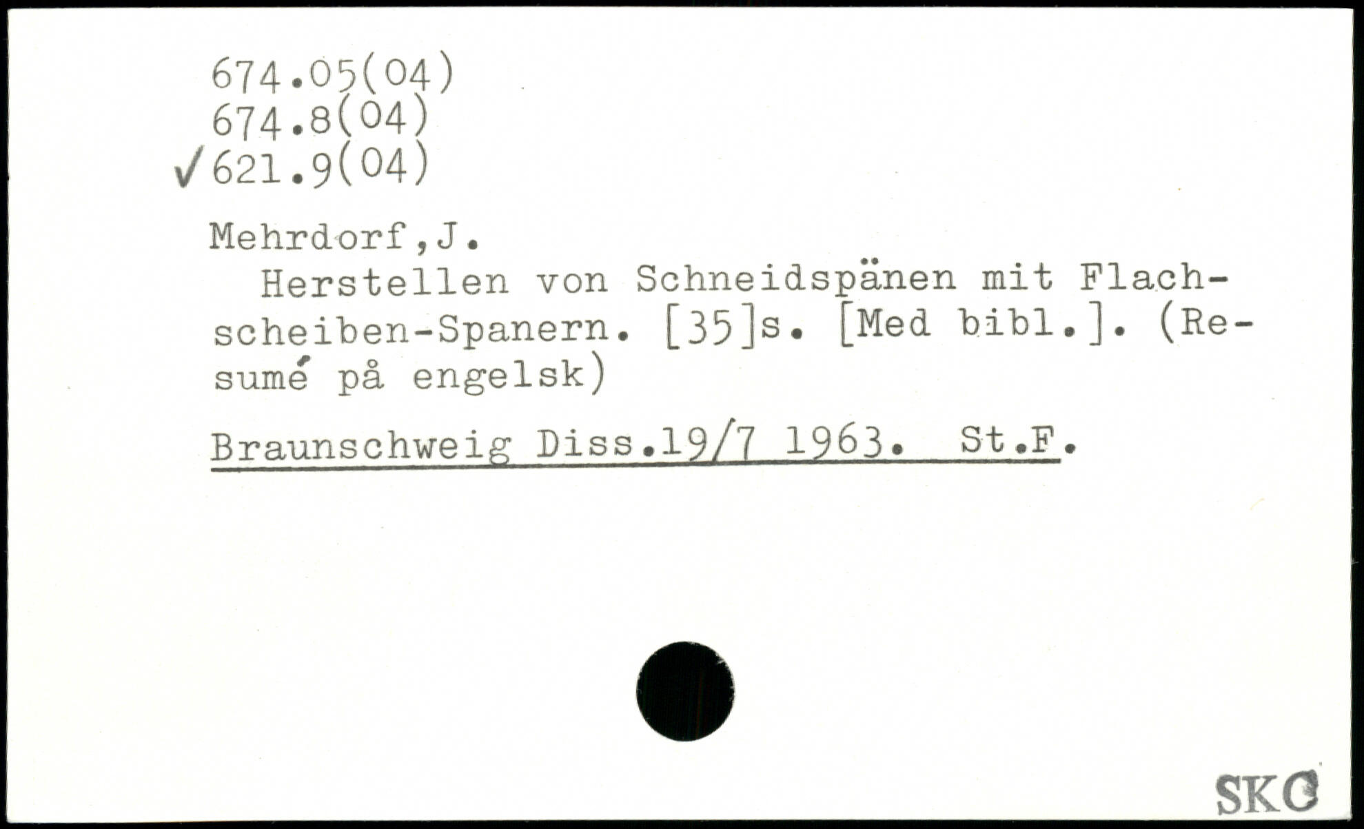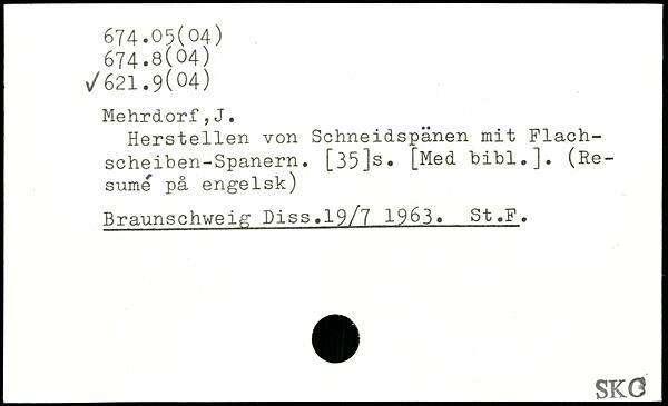 Herstellen von Schneidspänen mit Flach-scheihen-Spanern. [35]s. [Med bibl.]. (Resume pä engelsk) Braunschweig Piss.19/7 1963. St ,F.