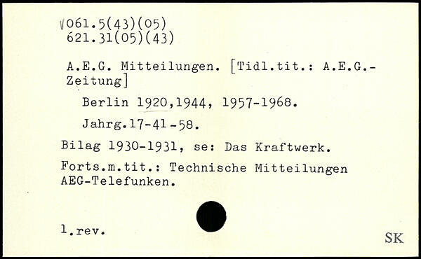A.E.G. Mitteilungen. [Tidl.tit.: A.E.G.-Zeitung]