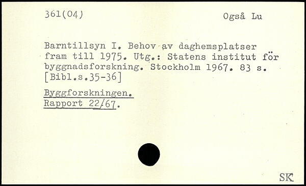 Barntillsyn I, Behov p,v daghemsplatser fram till 1975. Utg.: Statens institut for byggnadsforskning.