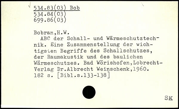 ABC der Schall- und Wärmeschutztech" nik. Eine Zusammenstellung der wichtigsten Begriffe des Schallschutzes, der Raumakustik und des baulichen Wärmeschutzes. Bad Wörishofen,Lobrecht-Verlag Dr.Albrecht Weinschenk,1960.