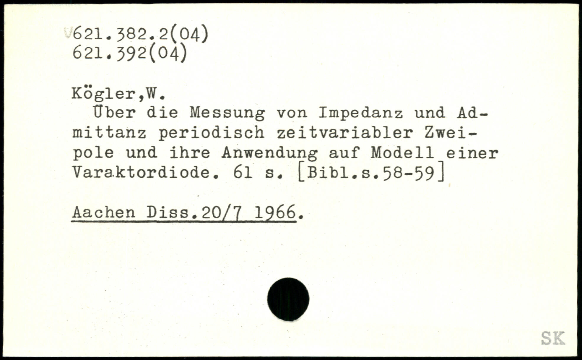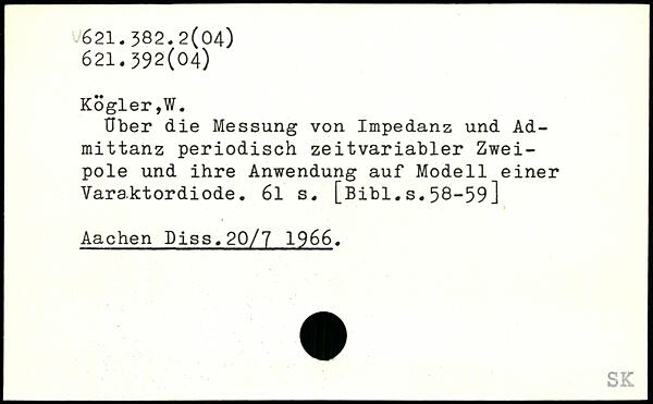 Uber die Messung von Impedanz und Ad-mittanz periodisch zeitvariabler Zweipole und ihre Anwendung auf Modell einer Varaktordiode. 6l s.