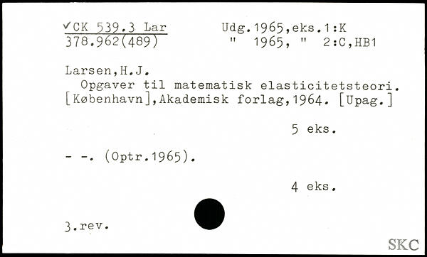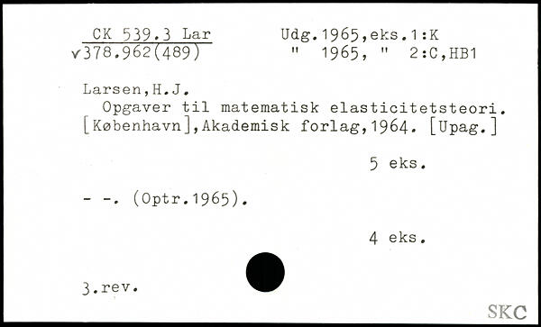 Opgaver til matematisk elasticitetsteori. [København],Akademisk forlag,1964. [Upag.]