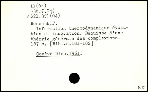 Infornation thermodynamique evolution et innovation. Esquisse d’une théorie générale des complexions.