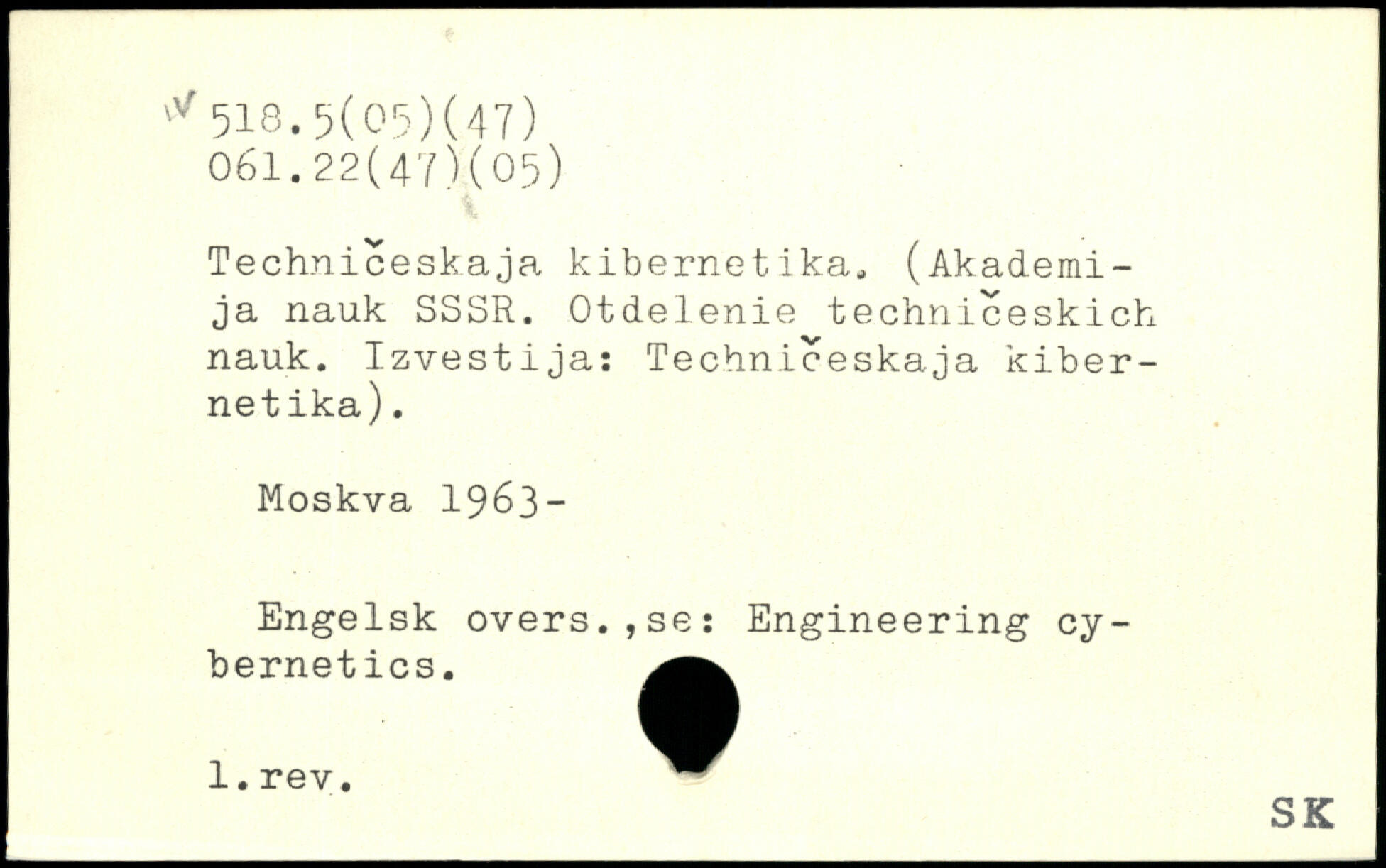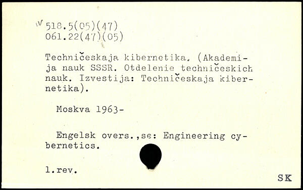 Techniceskaja kibernetika. (Akademi-ja nauk SSSR. Otdelenie techniceskich nauk. Izvestija: Techniceskaja kiber-netika).