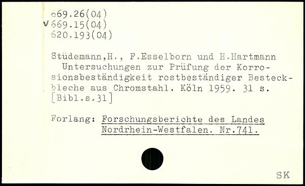 Stüdemann,H., P,Esselborn und H,Hartmann Untersuchungen zur Prüfung der Korrosionsbeständigkeit rostbeständiger Besteckbleche aus Chromstahl.