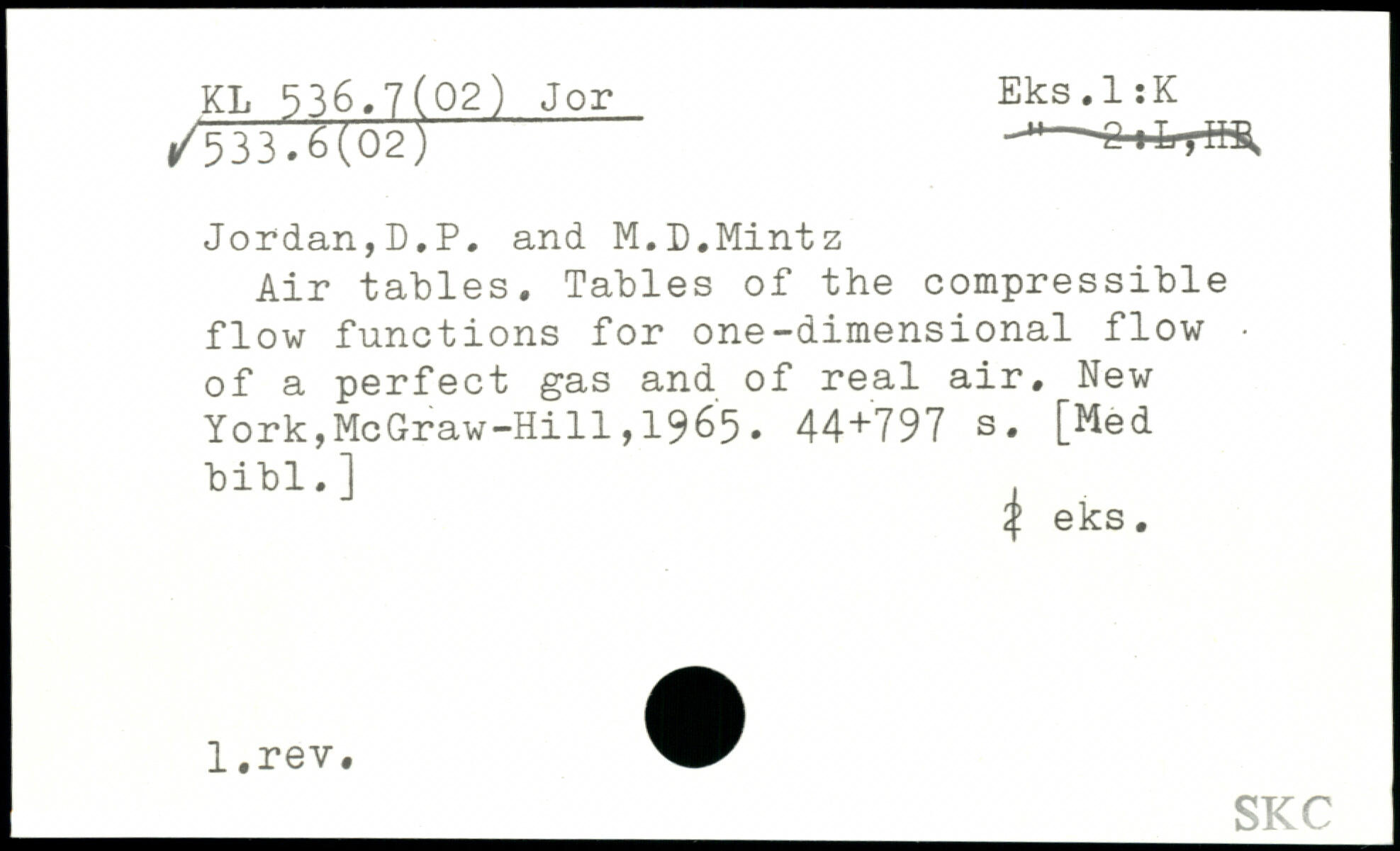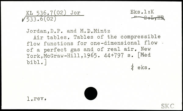 ✓533ÎSIÔ2) a 'LrBS. Jordan,D,P. and M.L.Mintz Air tables. Tables of the compressible flow functions for one-dimensional flow ■ of a perfect gas and of real air.