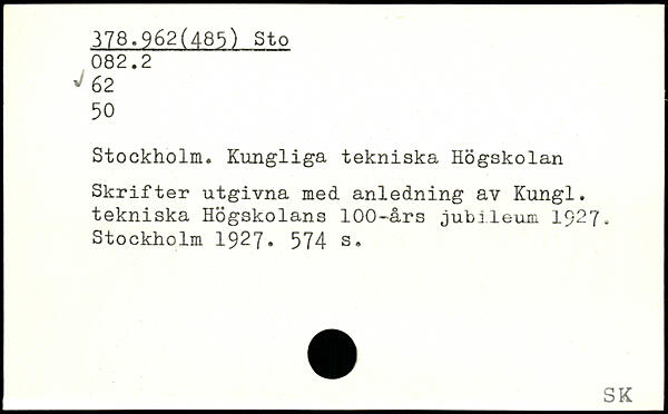 Stockholm. Kungliga tekniska Högskolan Skrifter utgivna med anledning av Kungl. tekniska Högskolans 100-års jubileum 1927.