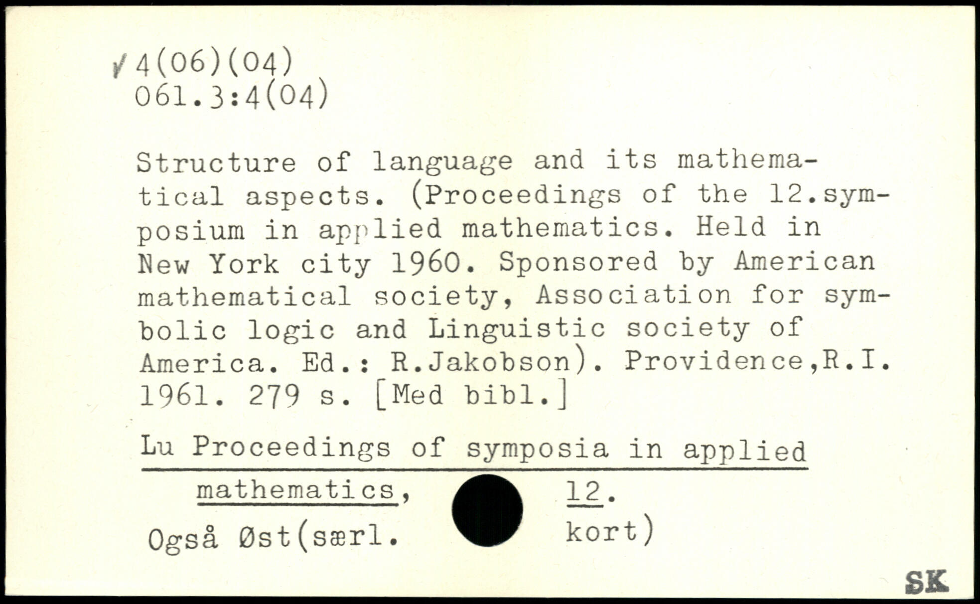 Structure of language and its mathematical aspects. (Proceedings of the 12.symposium in applied mathematics. Held in New York city 1960. Sponsored by American mathematical society, Association for symbolic logic and Linguistic society of America. Ed.: R.Jakobson). Providence,R.I. 1961.