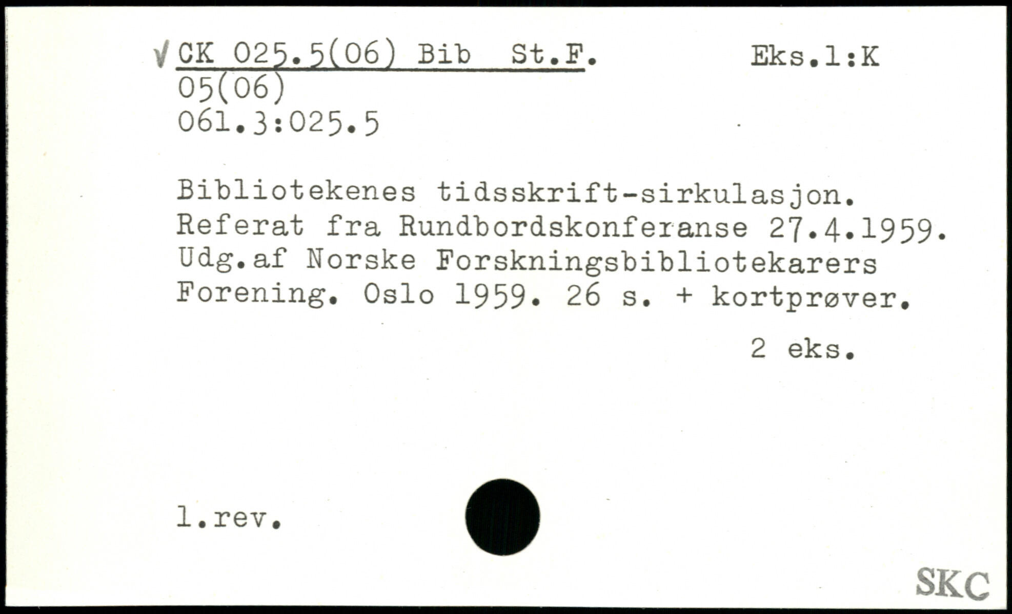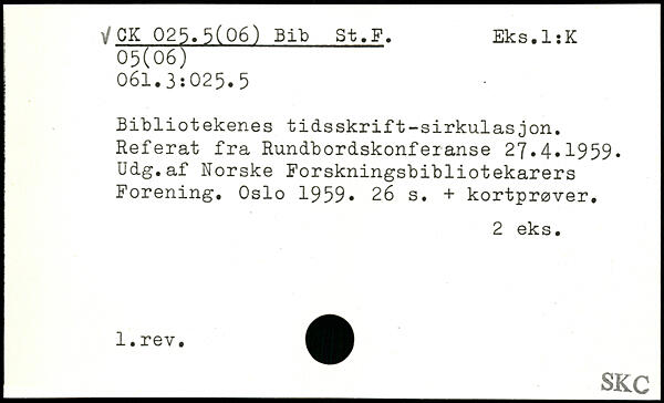 Bibliotekenes tidsskrift-sirkulasjon. Referat fra Rundbordskonferanse 27.4.1959. Udg.af Norske Forskningsbibliotekarers Forening, Oslo 1959