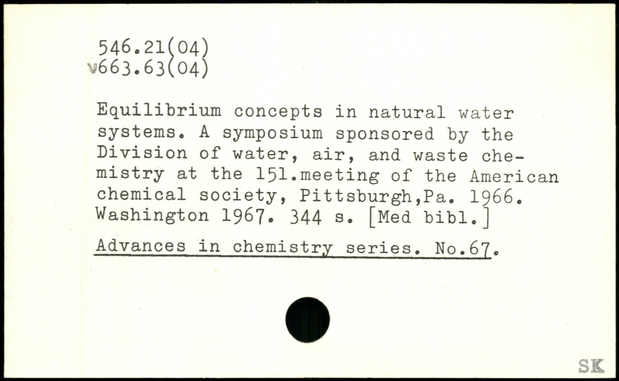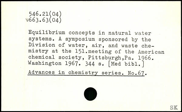 Equilibrium concepts in natural water systems. A symposium sponsored by the Division of water, air, and waste chemistry at the 151.meeting of the American chemical society, Pittsburgh,Pa. 1966.