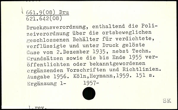 Druckgasverordnung, enthaltend die Poli-7jgIverordnung üher die ortsheweglichen geschlossenen Behälter für verdichtete, verflüssigte und unter Druck gelöste Gase vom 2.Dezember 1935, nebst Techn. Grundsätzen sowie die bis Ende 1955 veröffentlichten oder bekanntgewordenen ergänzenden Vorschriften und Richtlinien. Ausgabe 1956.