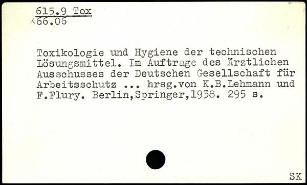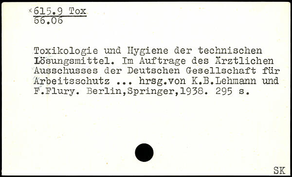 Toxikologie 'und Hygiene der technischen Lösungsmittel. Im Aufträge des Ärztlichen Ausschusses der Deutschen Gesellschaft für Arbeitsschutz ... hrsg.von K.B.Lehmann und P.Flury.