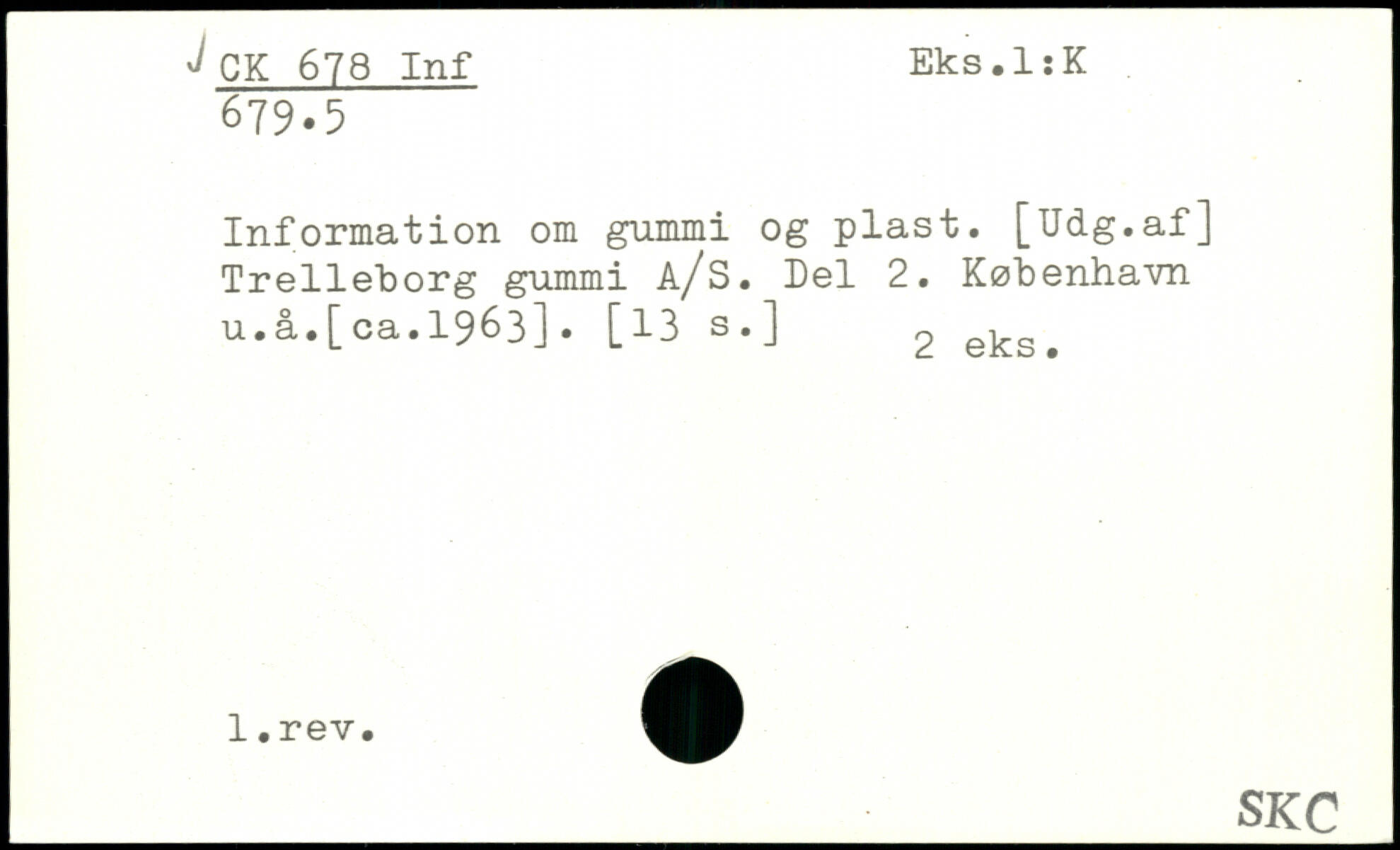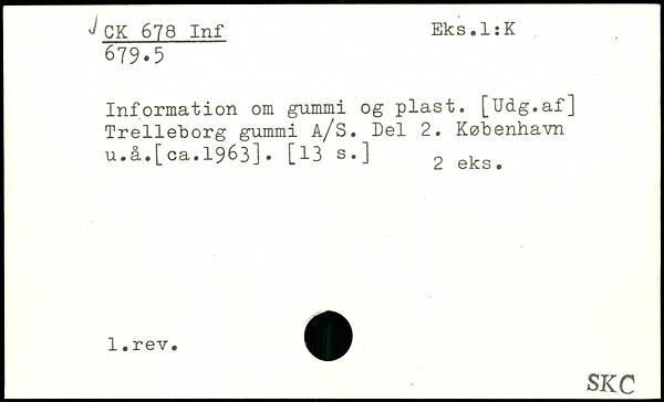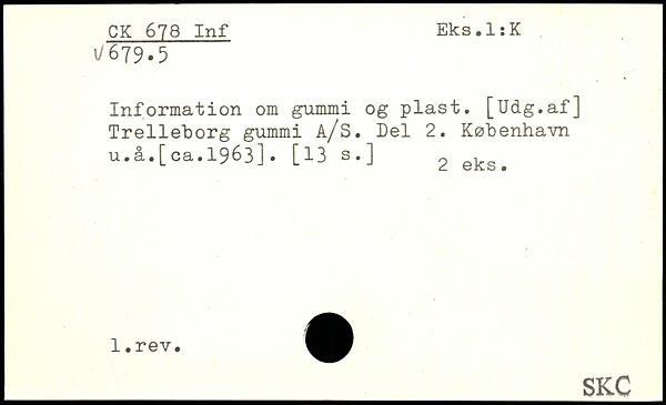 Information om gummi og plast. [Udg.af] Trelleborg gummi A/S. Del 2. København u.å.[ca.1963]. [