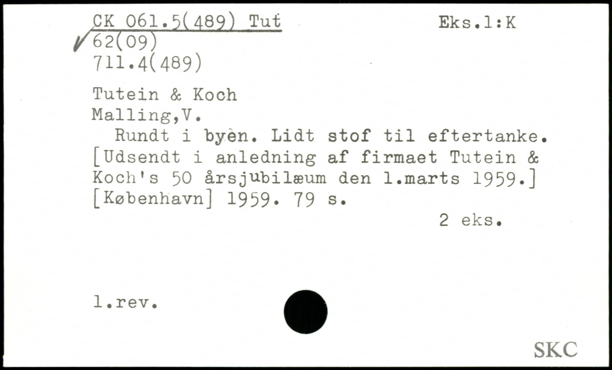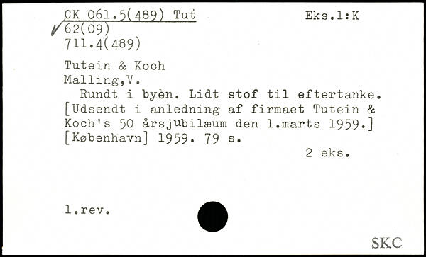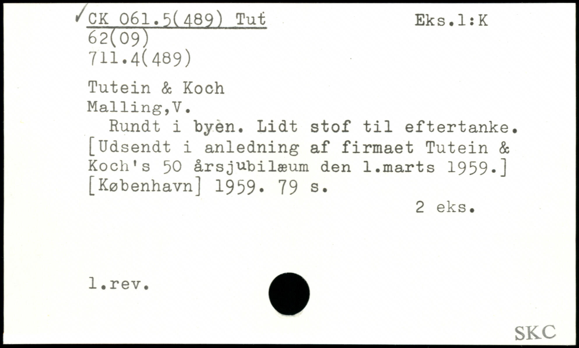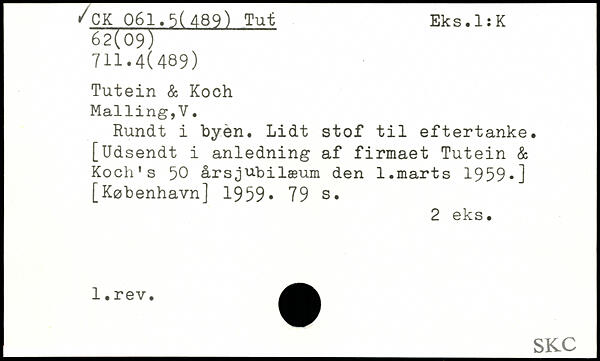 Rundt i "byen. Lidt stof til eftertanke. [Udsendt i anledning af firmaet Tutein & Koch's 50 årsjubilæum den 1.marts 1959-] j