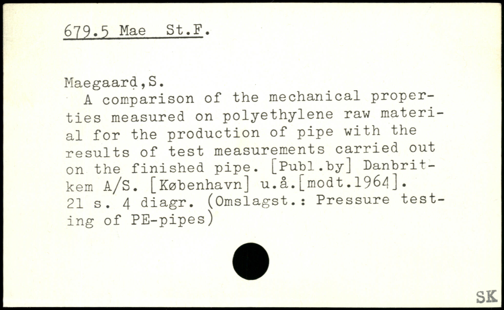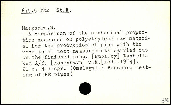 A comparison of the mechanical properties measured on polyethylene raw material for the production of pipe with the results of test measurements carried out on the finished pipe. [Publ.hy] Danbrit-kem A/S. [København] u.å.[modt.1964].