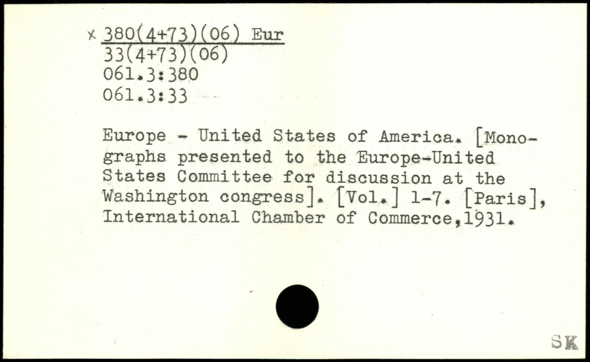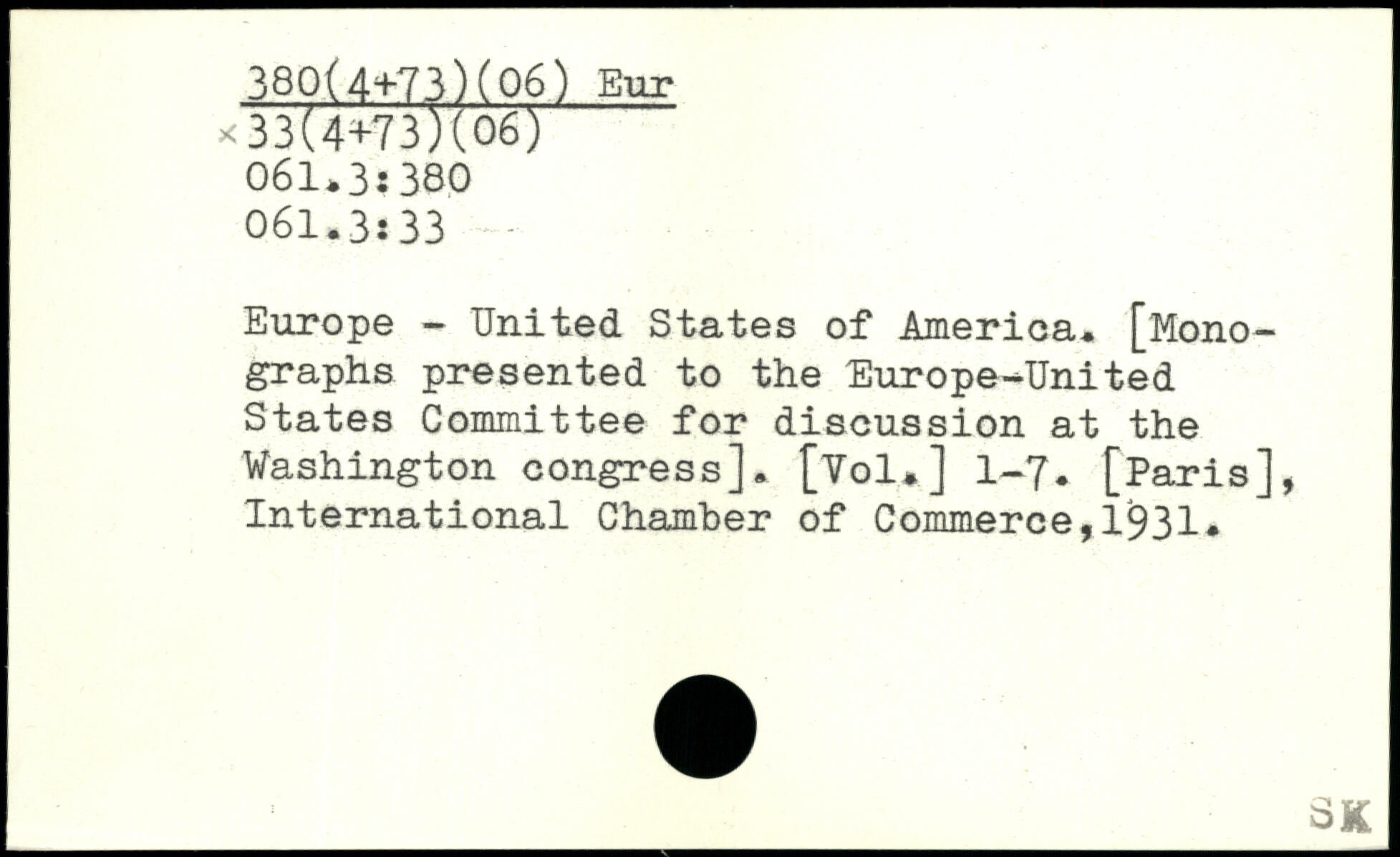 Europe - United States of America. [Monographs presented to the Europe-United States Committee for discussion at the Washington congress]. [Vol.] 1-7. [Paris], International Chamber of Commerce,1931.