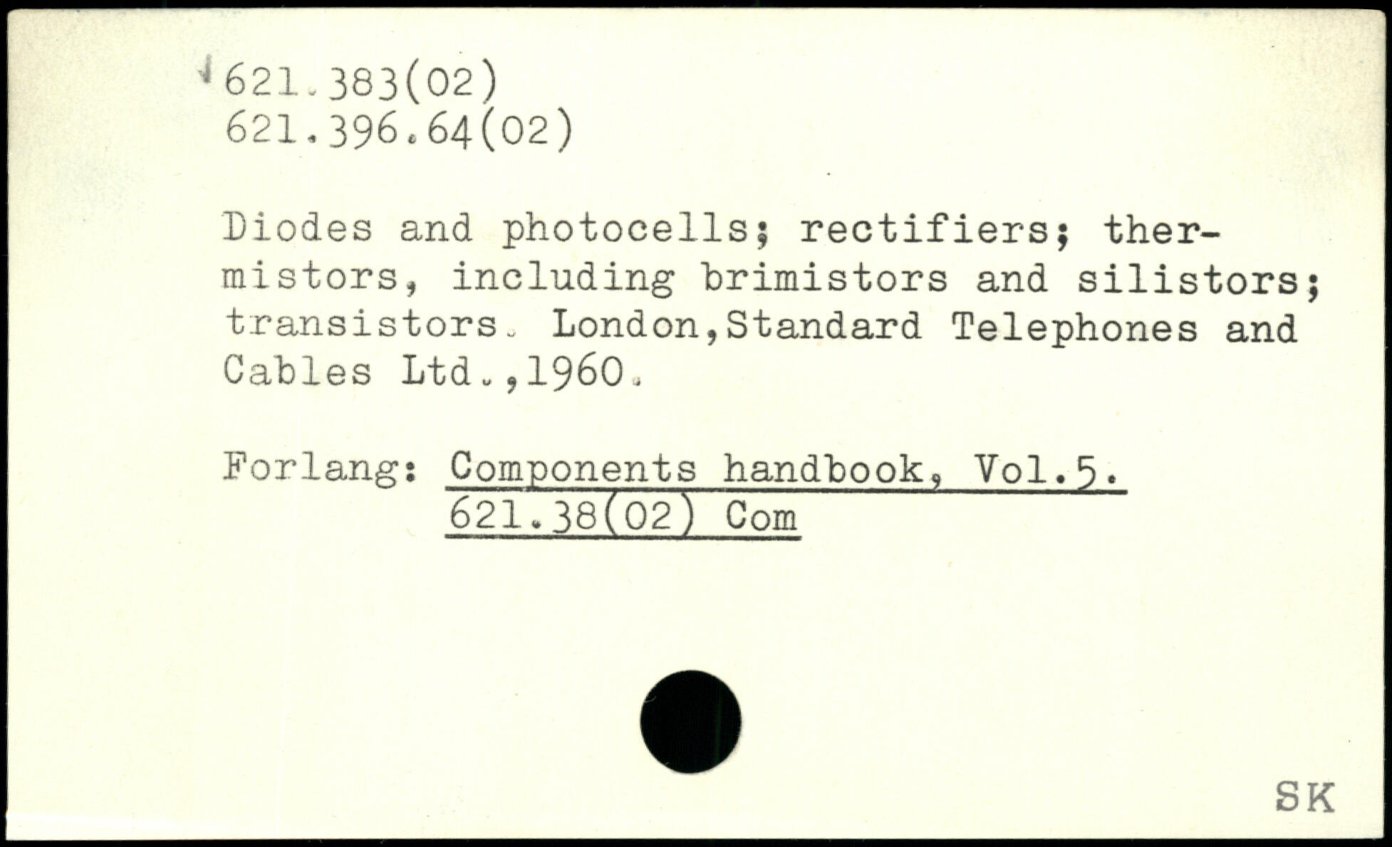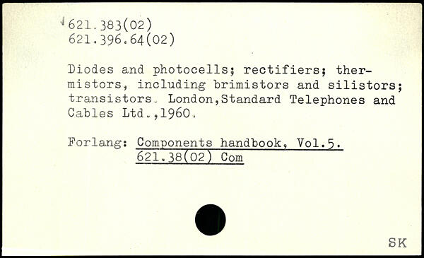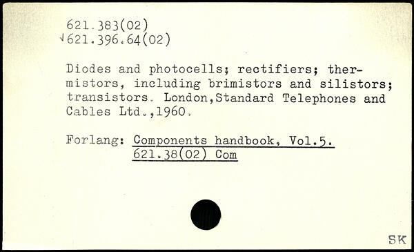 Diodes and photocells; rectifiers; thermistors, including hrimistors and silistors; transistors, London,Standard Telephones and Cables Ltd,,1960, Forlang: Components handbook