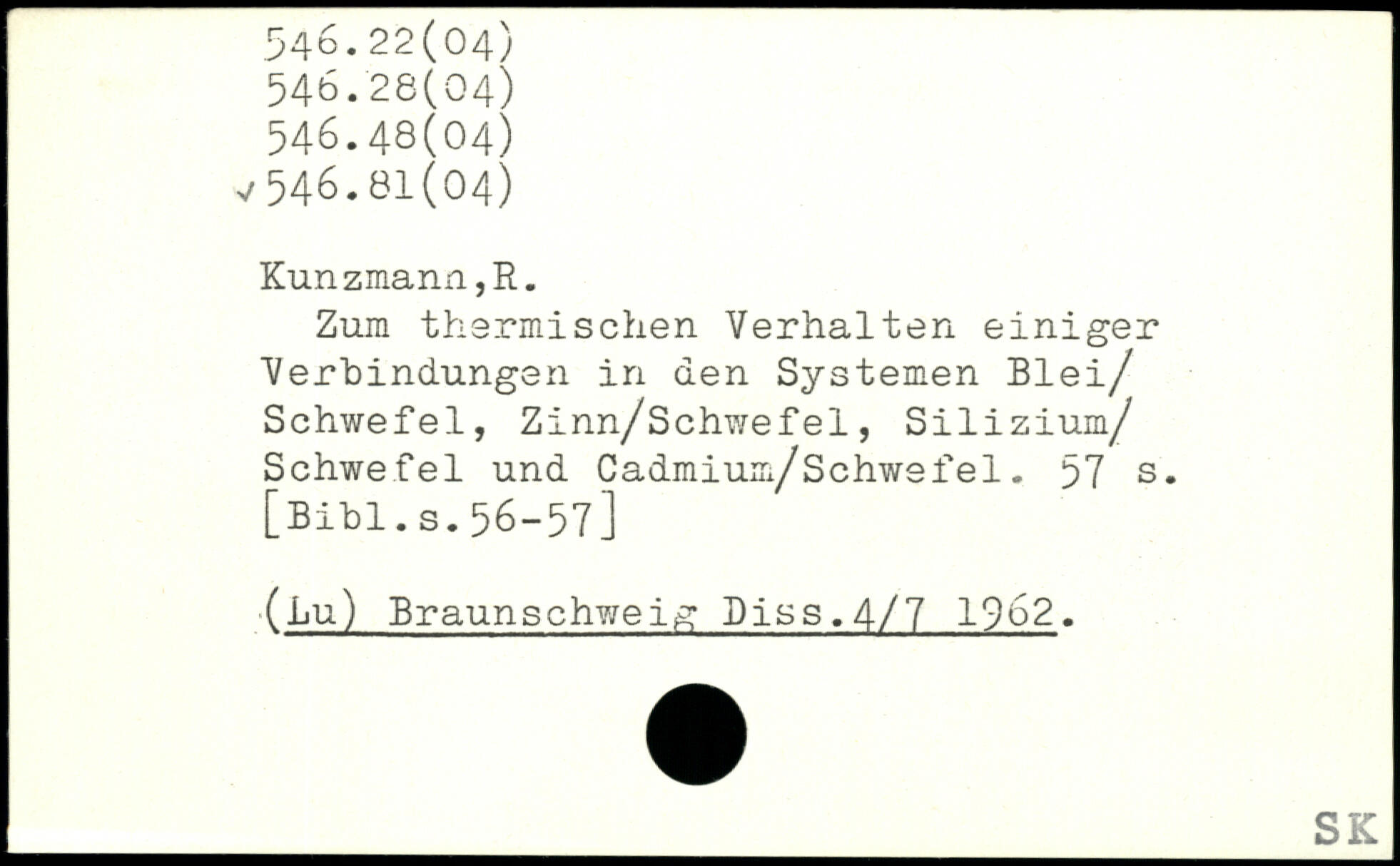 Zum thermischen Verhalten einiger Verbindungen in den Systemen Blei/ Schwefel, Zinn/Schwefel, Silizium/ Schwefel und Cadmium/Schwefel.