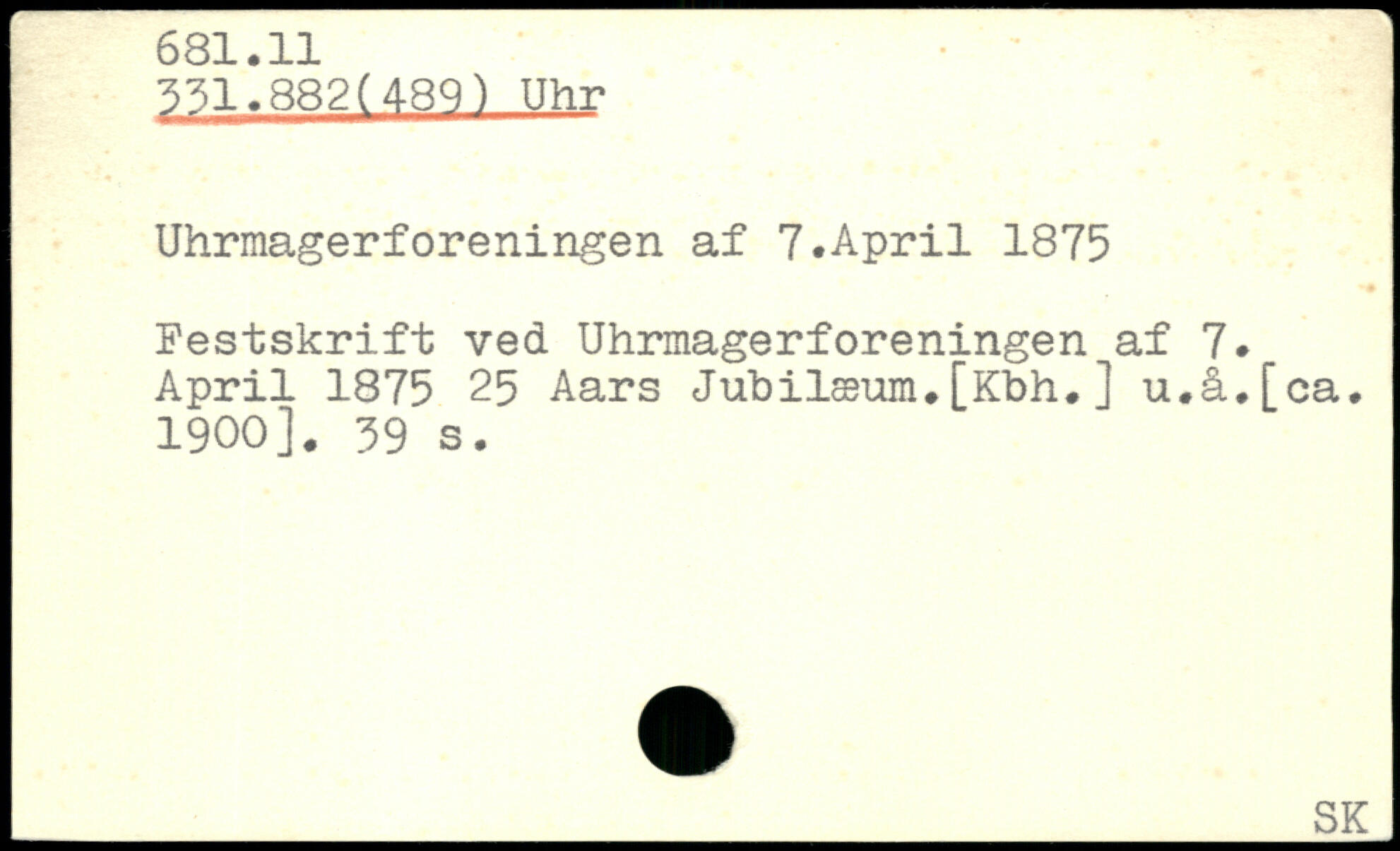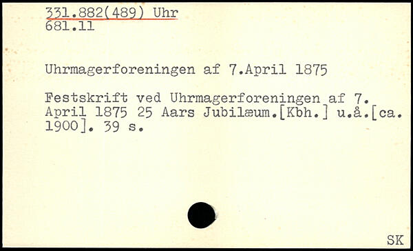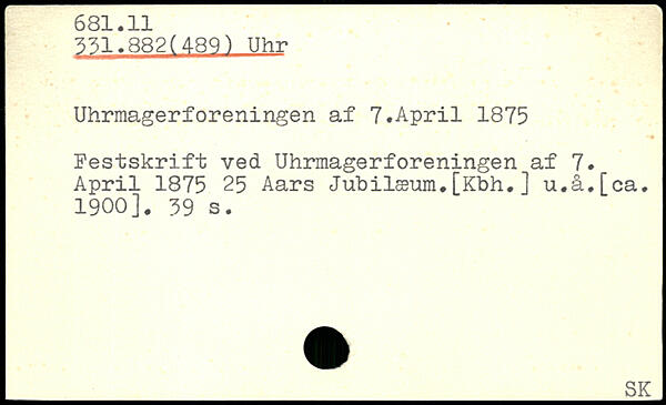 Uhrmagerforeningen af 7.April 1875 Festskrift ved Uhrmagerforeningen af 7. April 1875 25 Aars Jubilæum.[Kbh.] u.â,[ca. 1900].