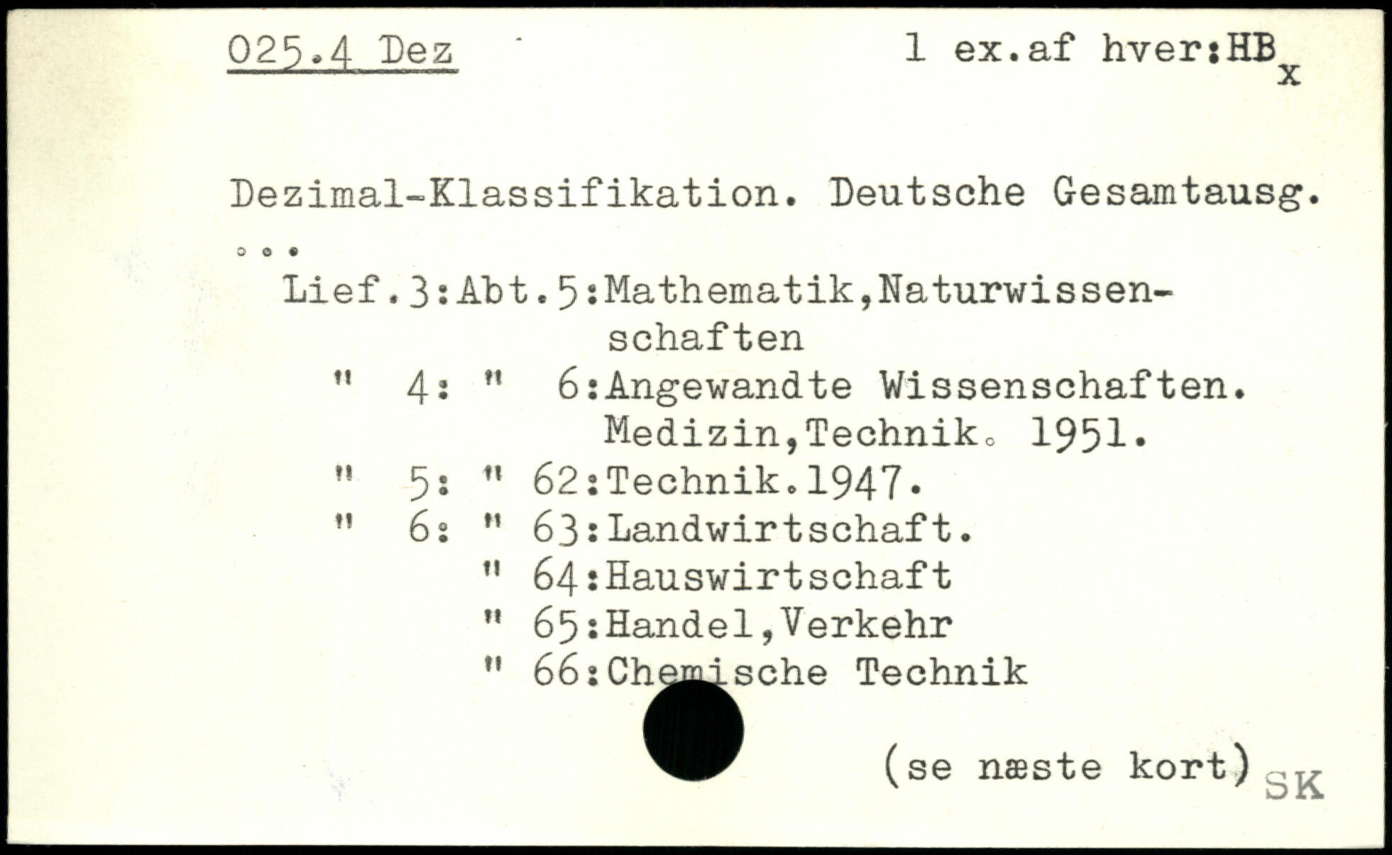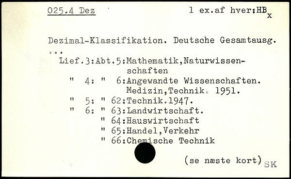 Dezimal-Klassifikation. Deutsche Gesamtausg. Lief.3:Abt.5:Mathematik,Naturwissen-schaften ” 4i " 6:Angewandte Wissenschaften. Medizin,Techniko 1951. ,! 5i M 62:Technik. 1947. M 6: M 63:Landwirtschaft. " 64:Hauswirtschaft ” 65:Handel,Verkehr " 66:Cha^sche Technik (se næste kort) ^