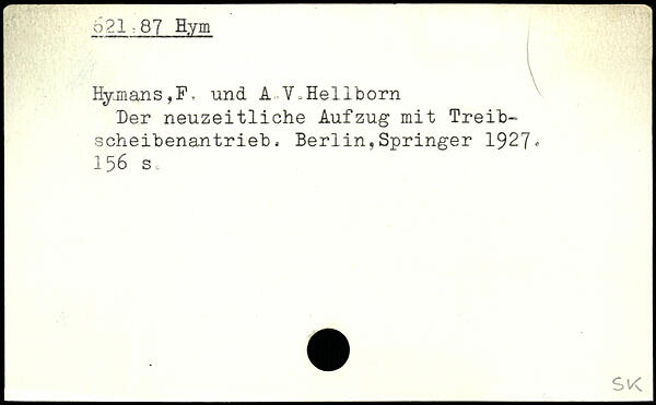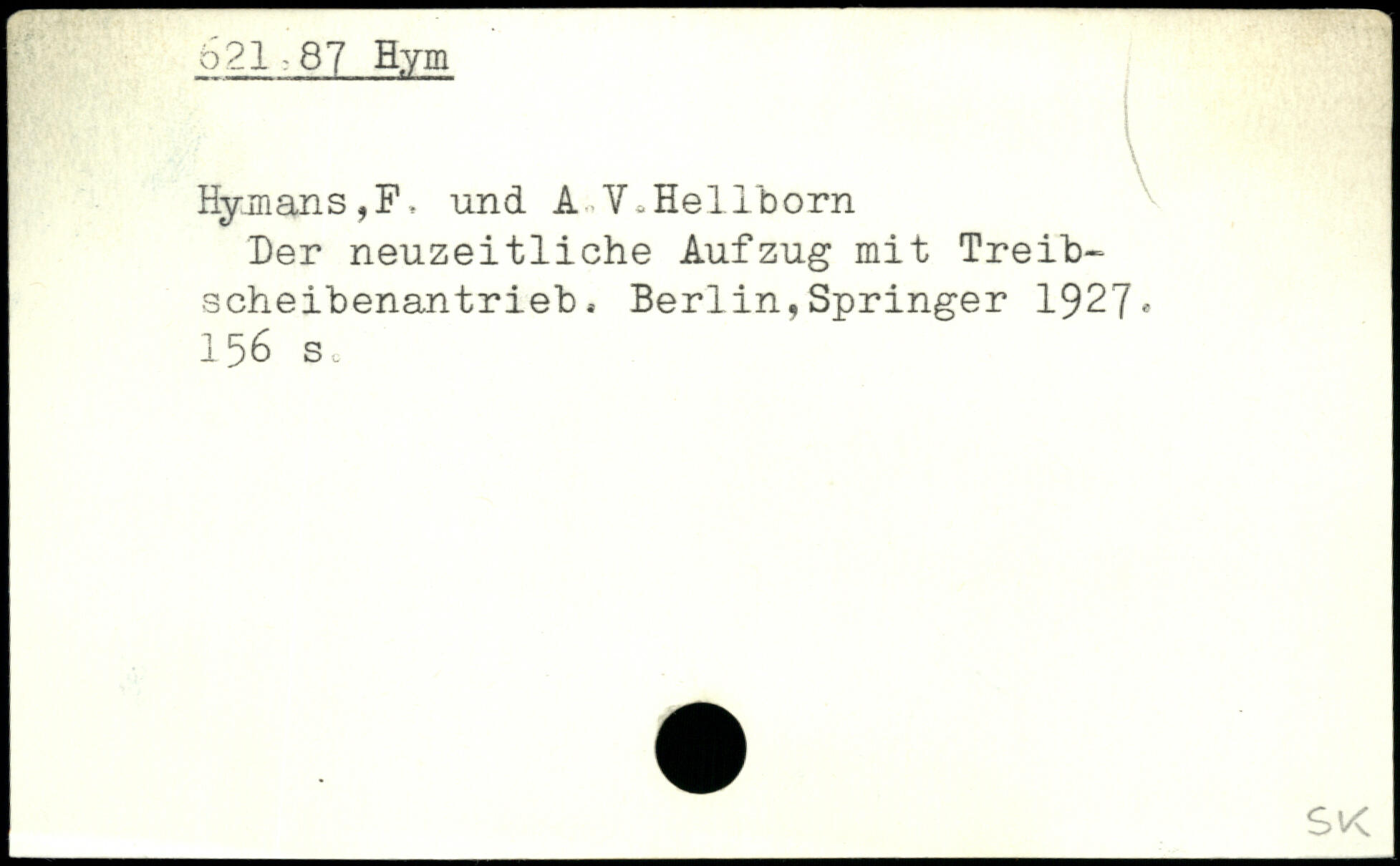 Hyjnans,F, und A V.Hellborn Der neuzeitliche Aufzug mit Treibscheibenantrieb, Berlin,Springer 1927' 156 B.