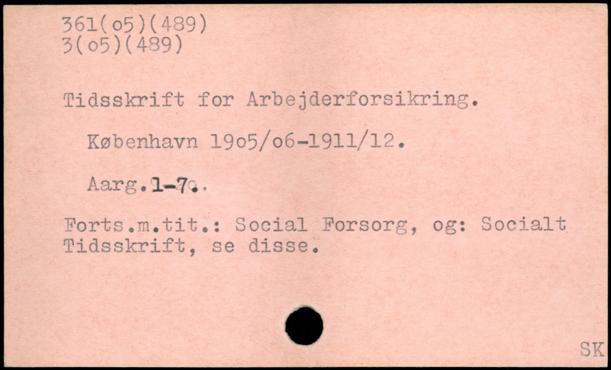 Tidsskrift for Arbejderforsikring. København 19o5/o6-1911/l2. Aarg. 1-7 ., Forts.m.tit.: Social Forsorg, og: Socialt Tidsskrift, se disse.