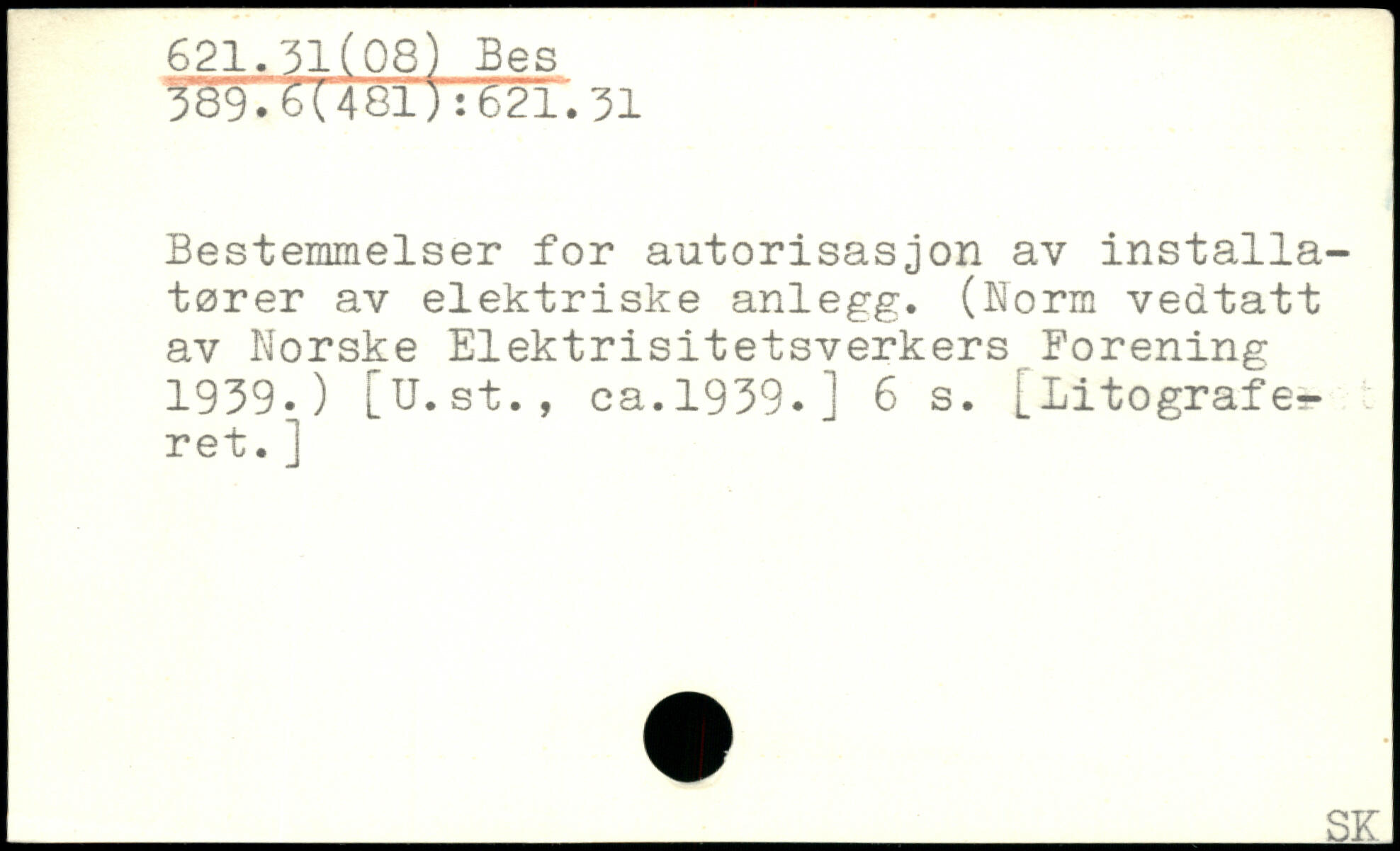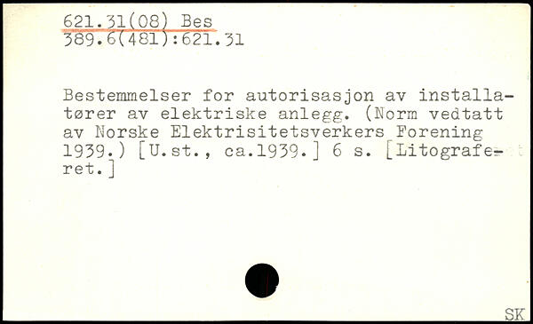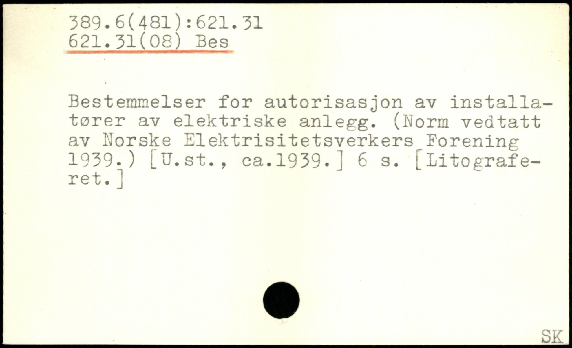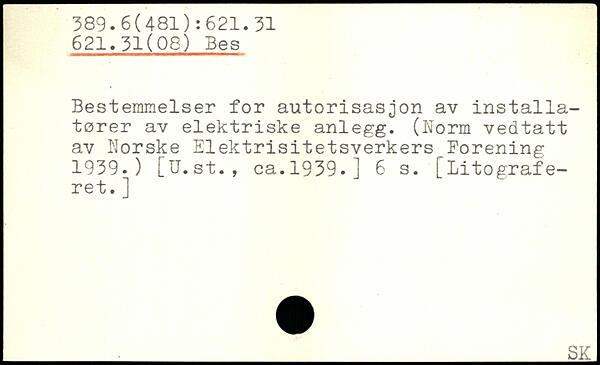 Bestemmelser for autorisasjon av installatører av elektriske anlegg. (Norm vedtatt av Norske Elektrisitetsverkers Forening 1939;) [U.st., ca.1939.]