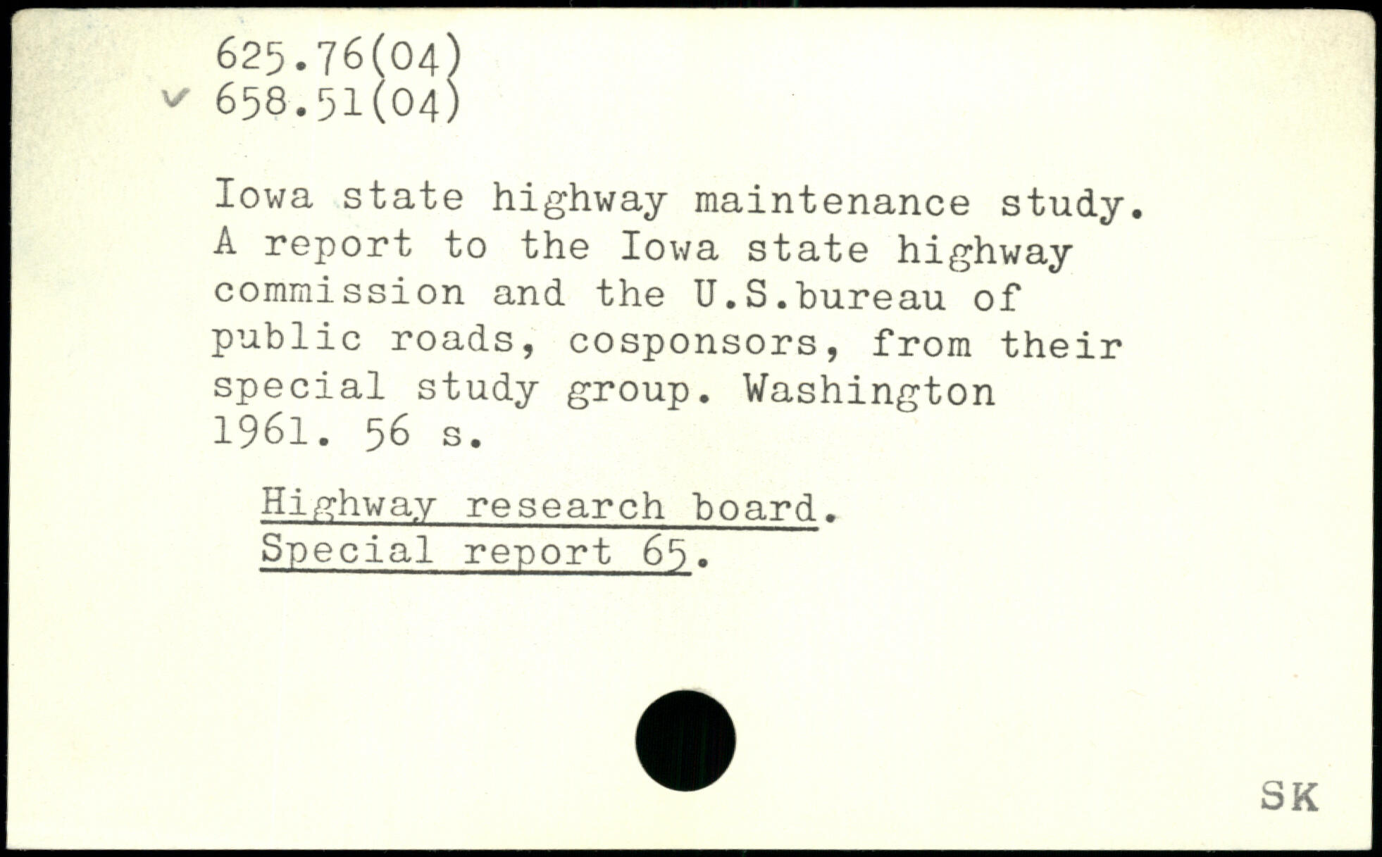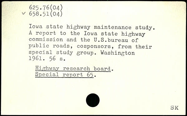Iowa state highway maintenance study. A report to the Iowa state highway commission and the U.S.bureau of public roads, cosponsors, from their special study group.