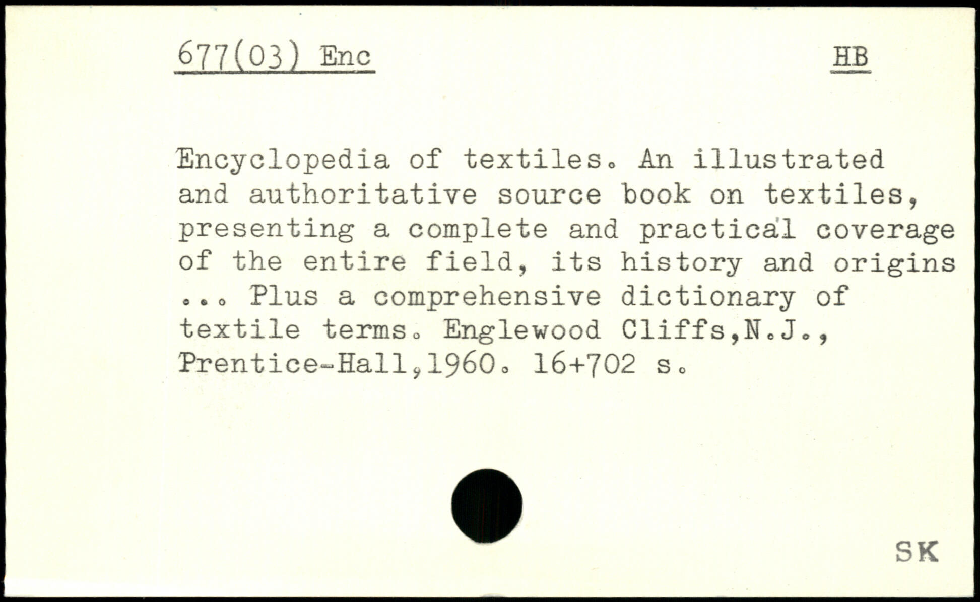 Encyclopedia of textiles,, An illustrated and authoritative source book on textiles, presenting a complete and practical coverage of the entire field, its history and origins .., Plus a comprehensive dictionary of textile terms, Englewood Cliffs,NoJ,, Prentice-Hall,1960o