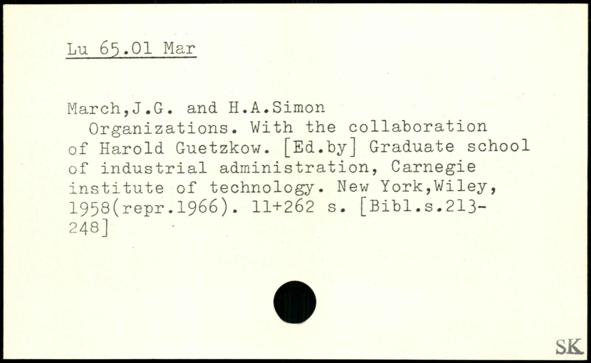 Organizations. With the collaboration of Harold Guetzkow. [Ed.by] Graduate school of industrial administration, Carnegie institute of technology. New York,Wiley, ; 1958(repr.1966).